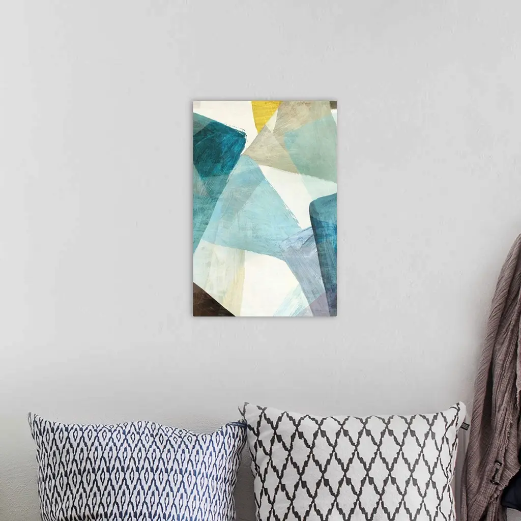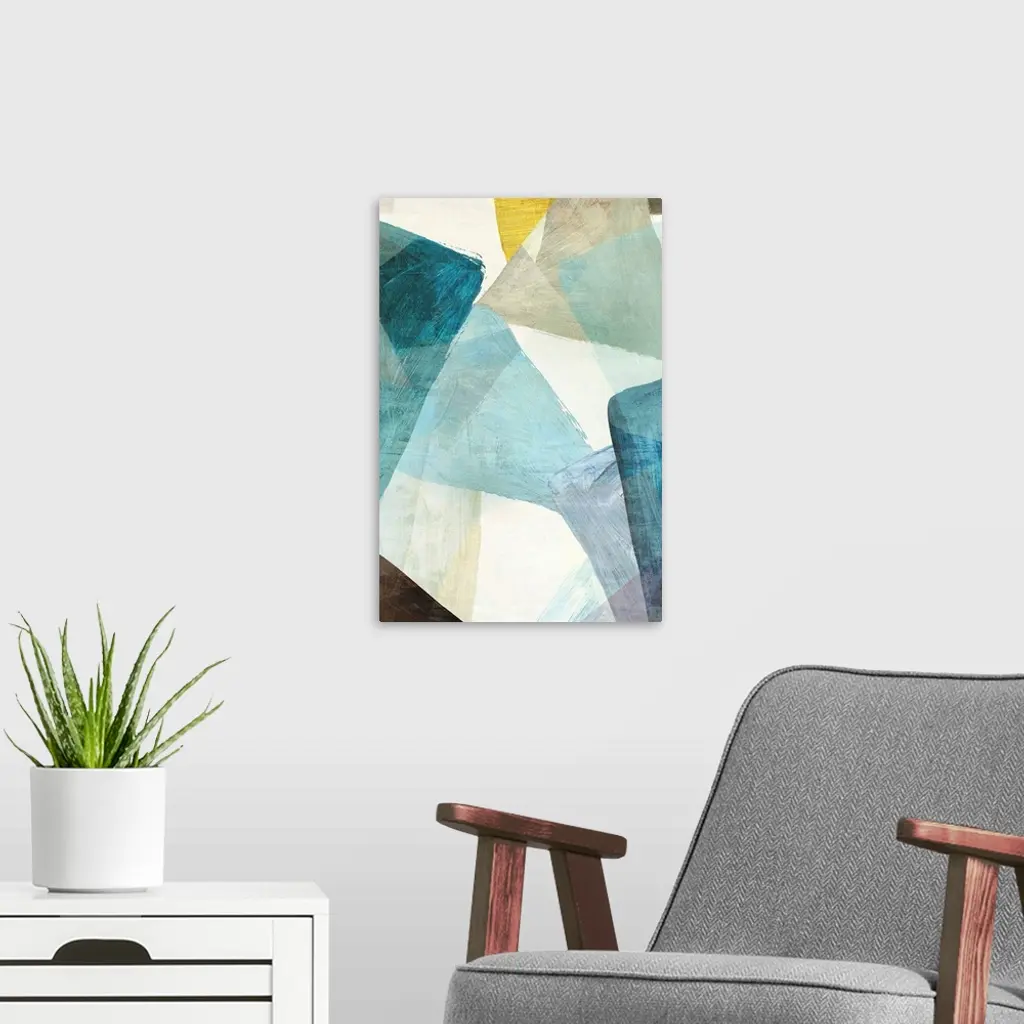 Abstract artwork of overlapping shapes in blue and yellow tones.