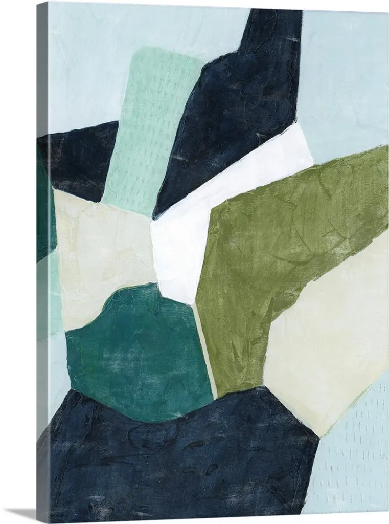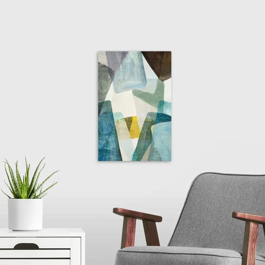 Abstract artwork of overlapping shapes in blue and yellow tones.