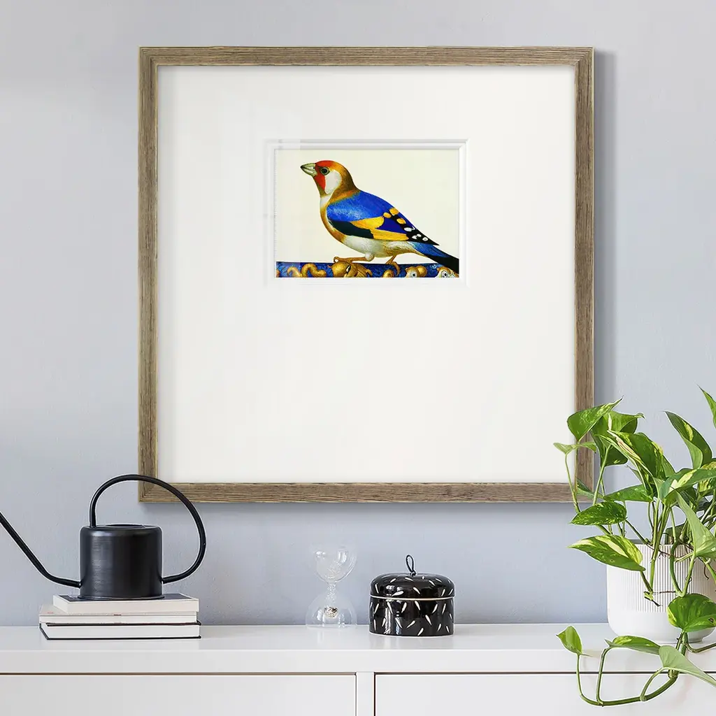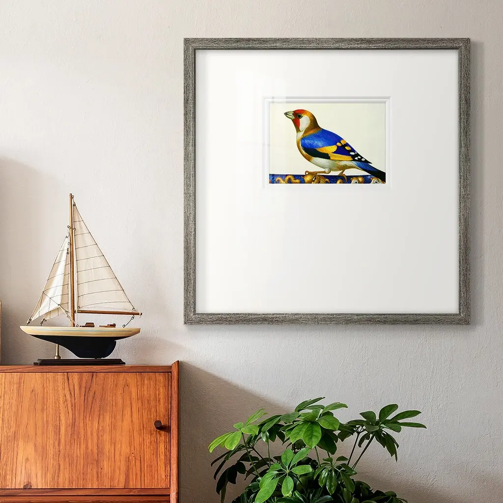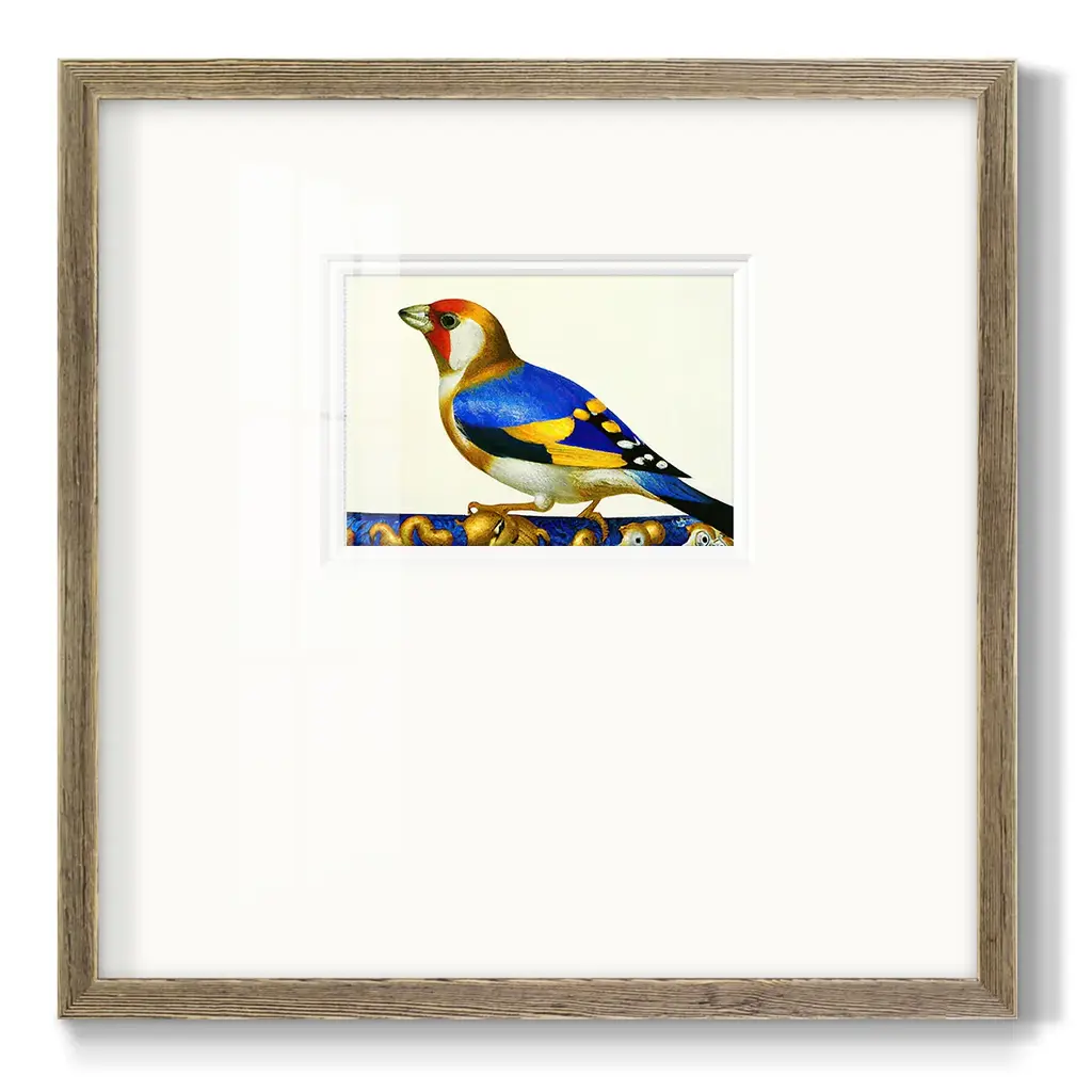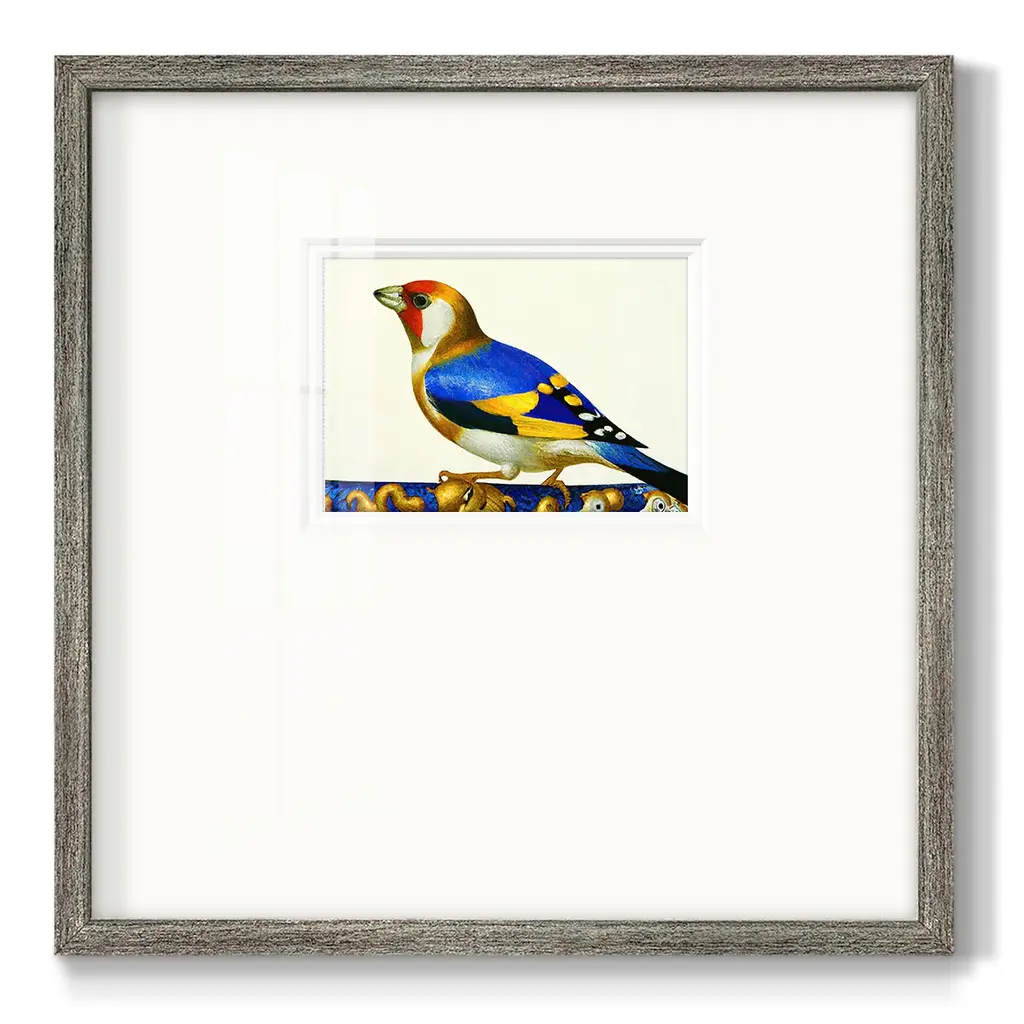 Blue Gold FinchPremium Framed Print A framed cold pressed paper print featuring superior double matting and quality frame. 2 SIZES AVAILABLE 16''X16''' - Overall Size 20''X20''' - Overall Size Each piece is made to order. Each piece comes with hanging hardware. Made in the USA Ready to Hang Giclee Paper Print Plexiglass Beveled Matt Board Double Matte Board