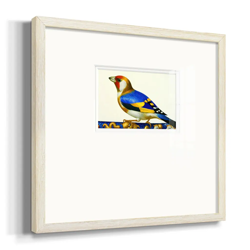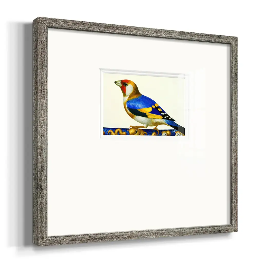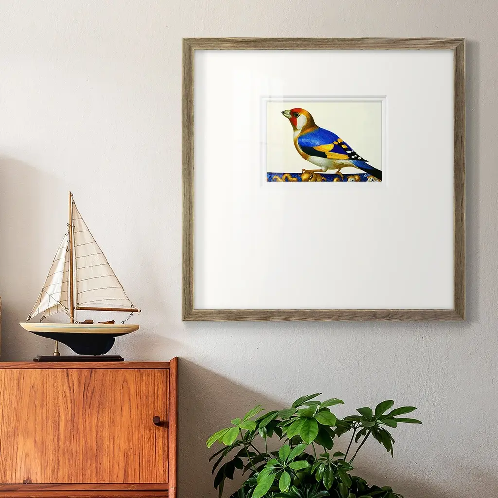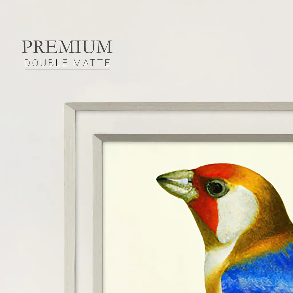 Blue Gold FinchPremium Framed Print A framed cold pressed paper print featuring superior double matting and quality frame. 2 SIZES AVAILABLE 16''X16''' - Overall Size 20''X20''' - Overall Size Each piece is made to order. Each piece comes with hanging hardware. Made in the USA Ready to Hang Giclee Paper Print Plexiglass Beveled Matt Board Double Matte Board