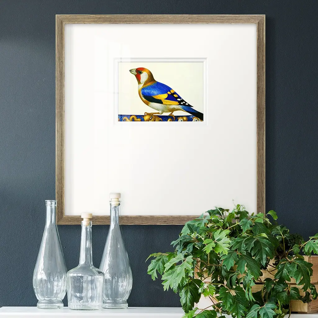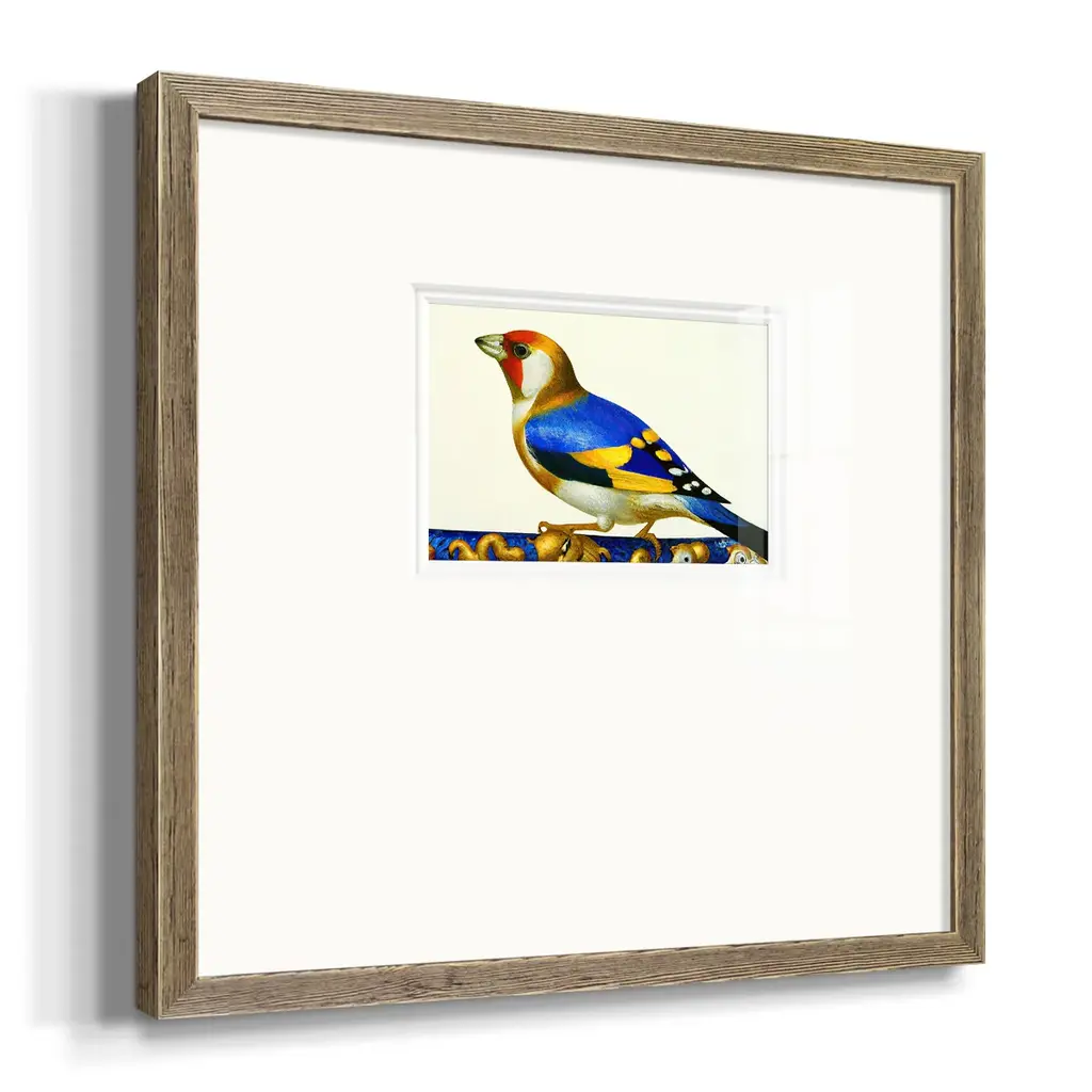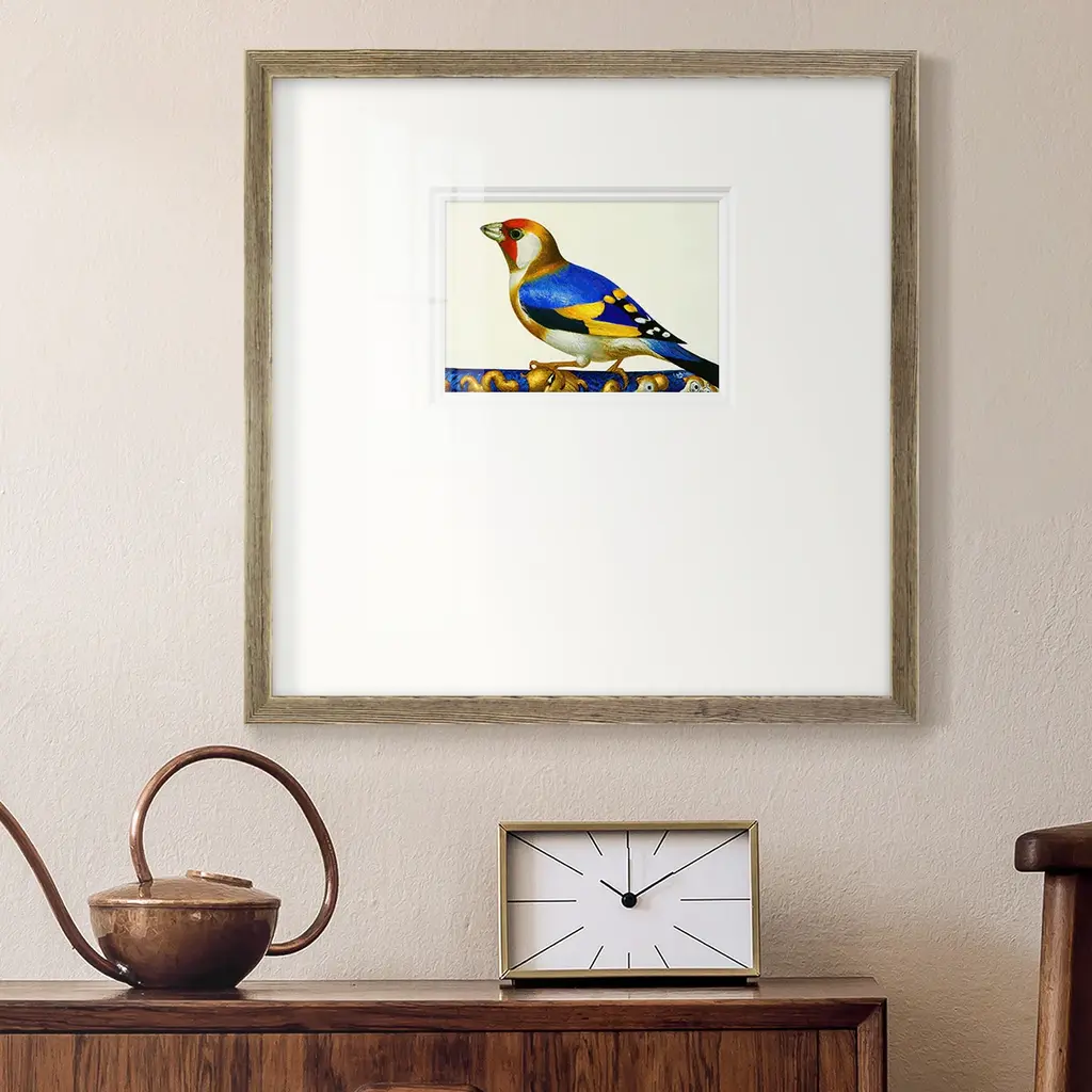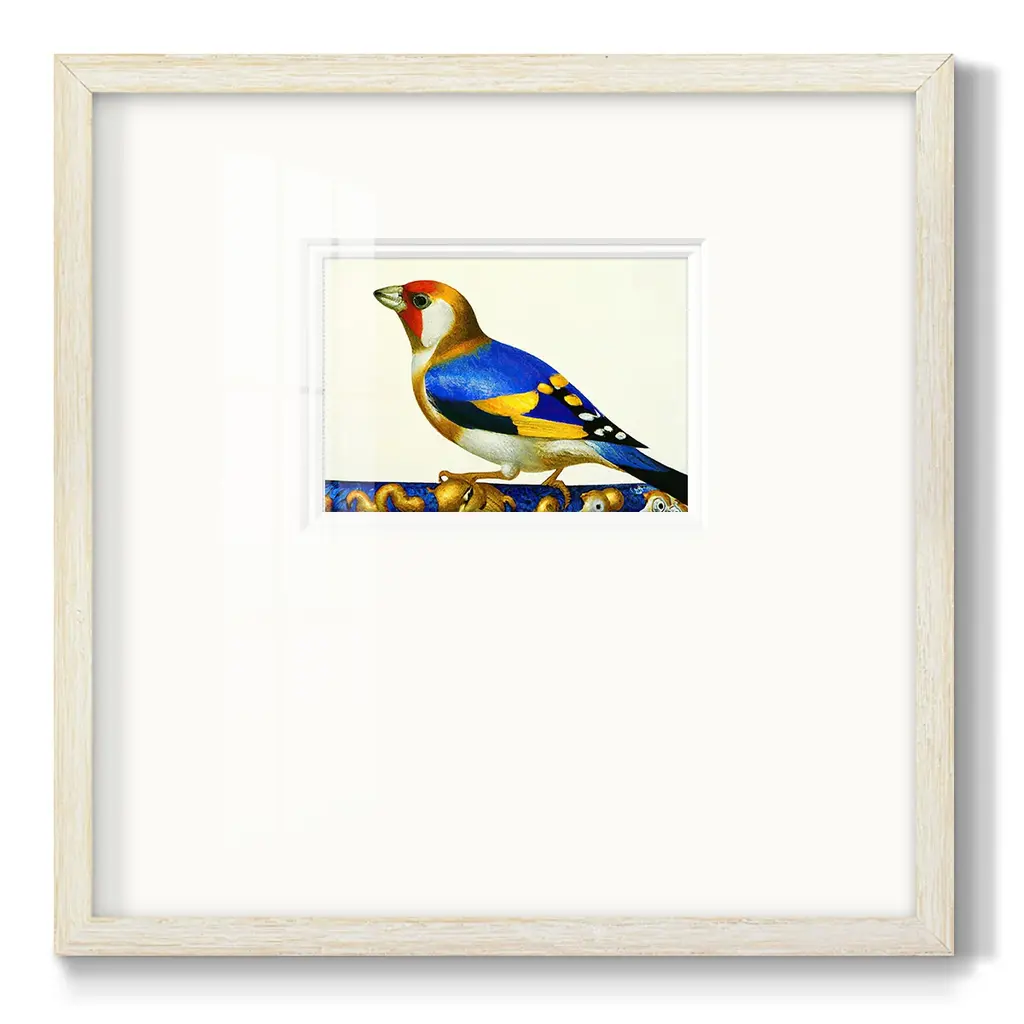 Blue Gold FinchPremium Framed Print A framed cold pressed paper print featuring superior double matting and quality frame. 2 SIZES AVAILABLE 16''X16''' - Overall Size 20''X20''' - Overall Size Each piece is made to order. Each piece comes with hanging hardware. Made in the USA Ready to Hang Giclee Paper Print Plexiglass Beveled Matt Board Double Matte Board