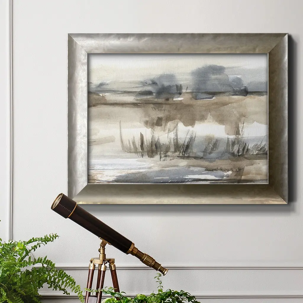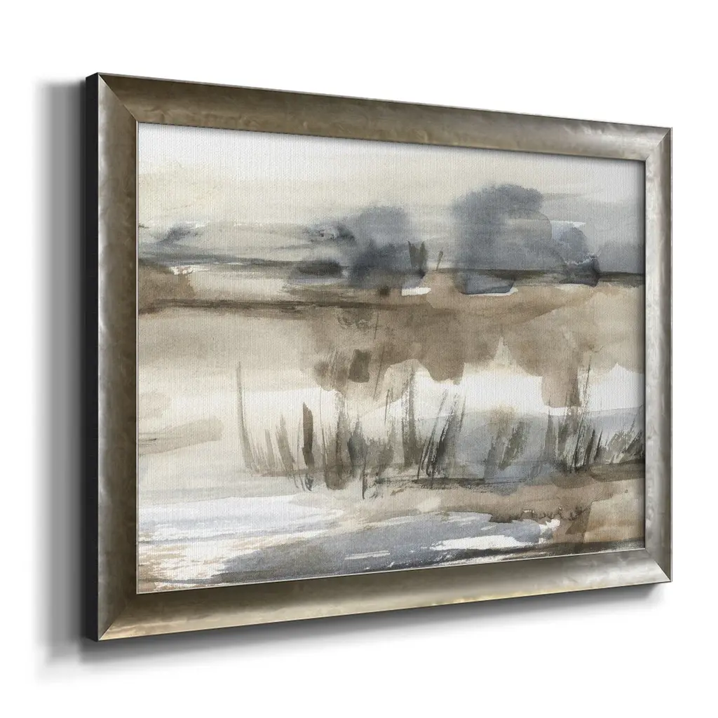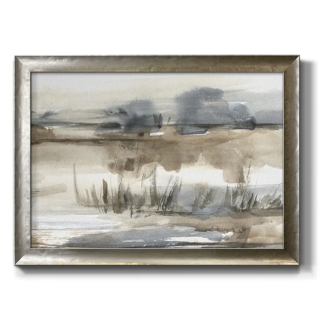 Blue-Grey Marsh I Premium Framed Canvas- Ready to Hang A Premium Framed Canvas created to last. Framed in distressed wood and available in an array of sizes and colors Featuring a beveled a solid wood stretcher bar, each piece comes ready to hand 3 SIZES AVAILABLE 16''X20'' - Overall Size 18'X27'' - Overall Size 24''x36'' - Overall Size Each piece is made to order. Each piece comes with hanging hardware. Made in the USA Ready to Hang Giclee Paper Print Acrylic Glass Beveled Matt Board