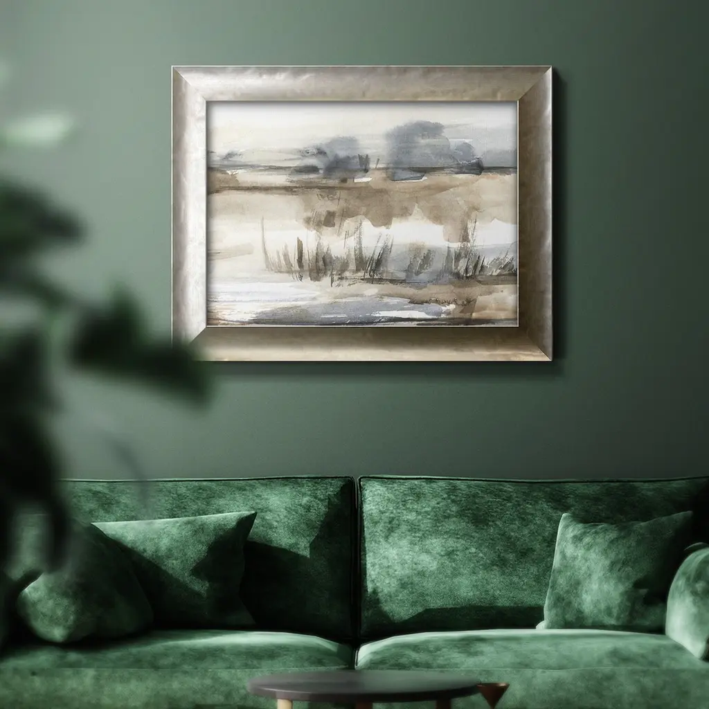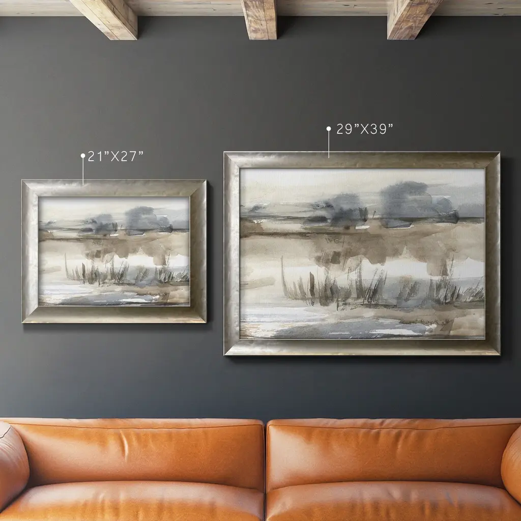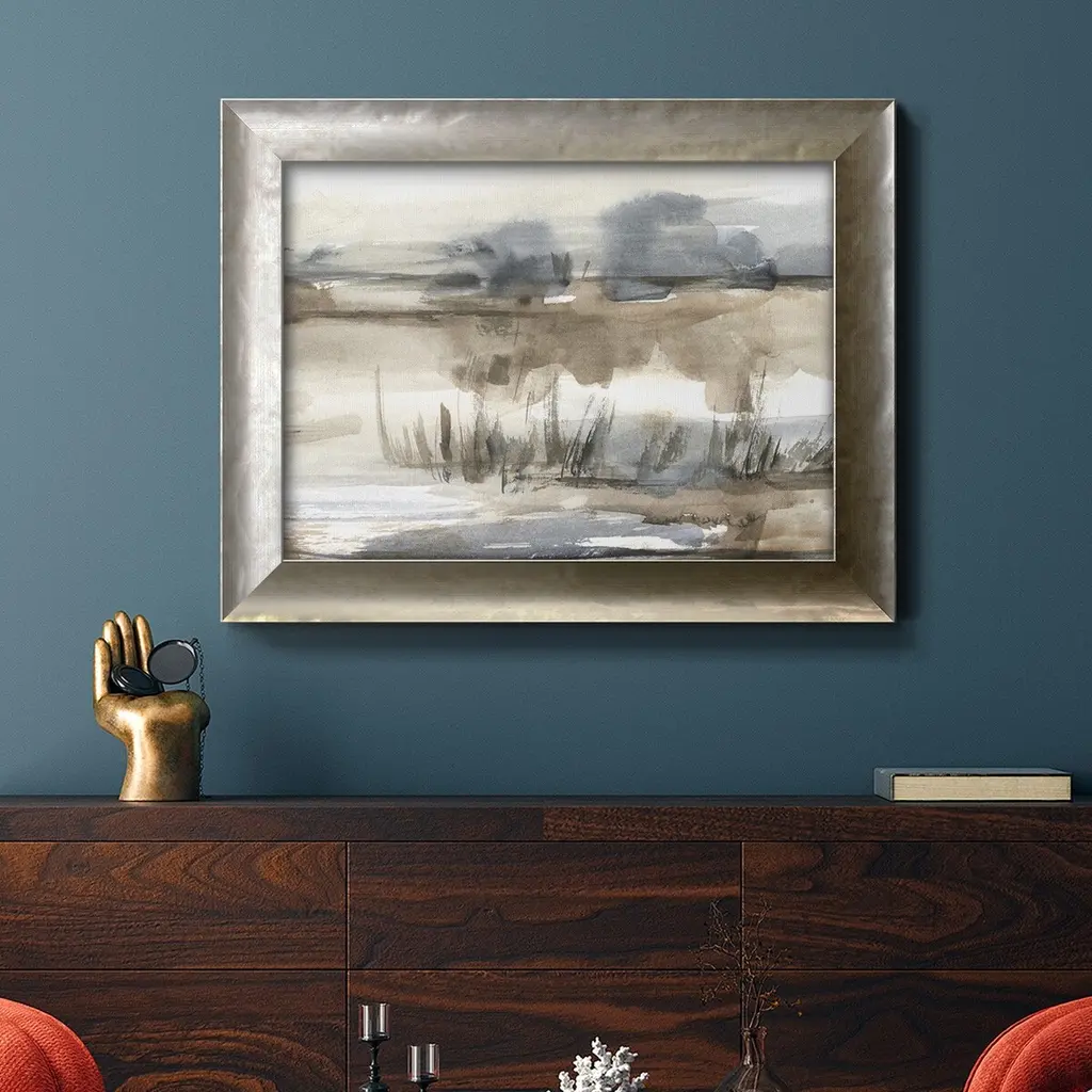 Blue-Grey Marsh I Premium Framed Canvas- Ready to Hang A Premium Framed Canvas created to last. Framed in distressed wood and available in an array of sizes and colors Featuring a beveled a solid wood stretcher bar, each piece comes ready to hand 3 SIZES AVAILABLE 16''X20'' - Overall Size 18'X27'' - Overall Size 24''x36'' - Overall Size Each piece is made to order. Each piece comes with hanging hardware. Made in the USA Ready to Hang Giclee Paper Print Acrylic Glass Beveled Matt Board