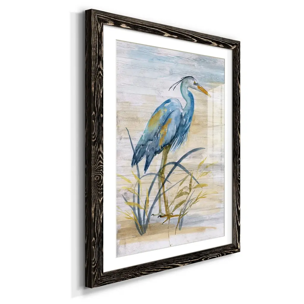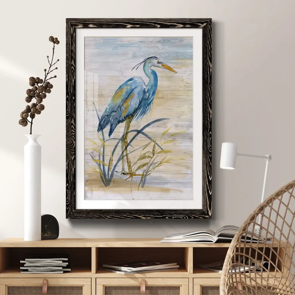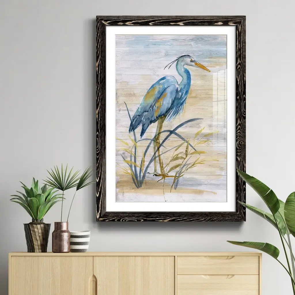 Blue Heron I-Premium Framed Print - Ready to Hang Framed in distressed wood and available in an array of sizes and colors Each piece is joined and assembled by hand and comes ready to hang 2 INCH BEVELED MATTE BOARD PLEXIGLASS COVERING READY TO HANG MADE IN THE USA SOLID WOOD FRAME MADE IN USA FADE RESISTANT GICLEE PRINTING on Canvas or Paper