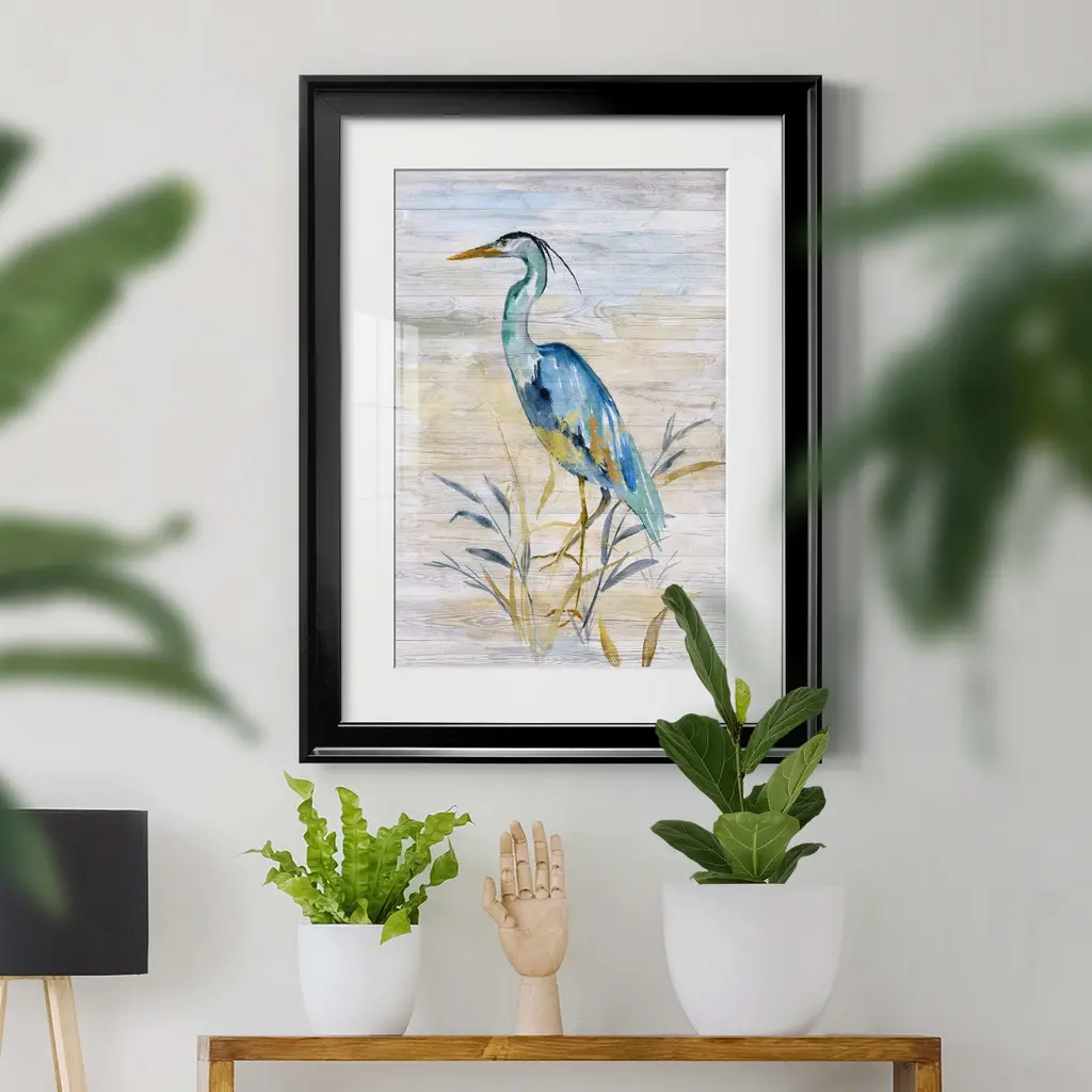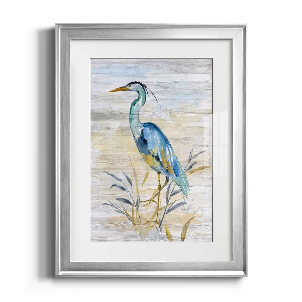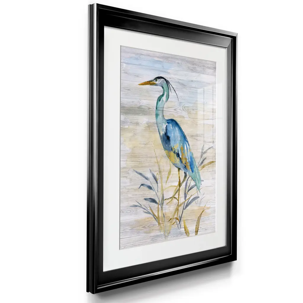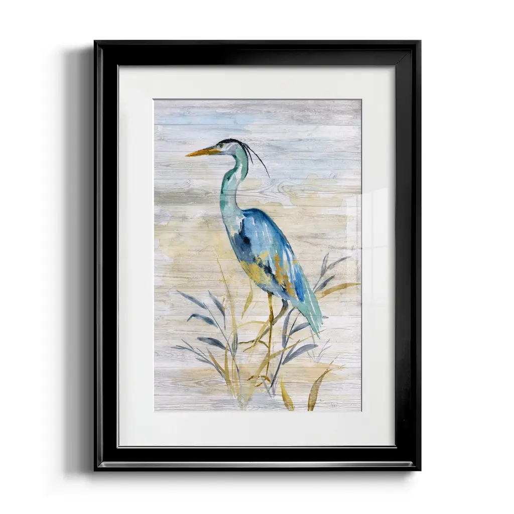 Blue Heron II Premium Framed Print - Ready to Hang A Premium Framed Print created to last. Framed in distressed wood and available in an array of sizes and colors Featuring a beveled a solid wood stretcher bar, each piece comes ready to hand 4 SIZES AVAILABLE 30.5''X42.5'' - Overall Size 26.5'X36.5'' - Overall Size 22''x30'' - Overall Size 18''x24'' - Overall Size Each piece is made to order. Each piece comes with hanging hardware. Made in the USA Ready to Hang Giclee Paper Print Acrylic Glass Beveled Matt Board