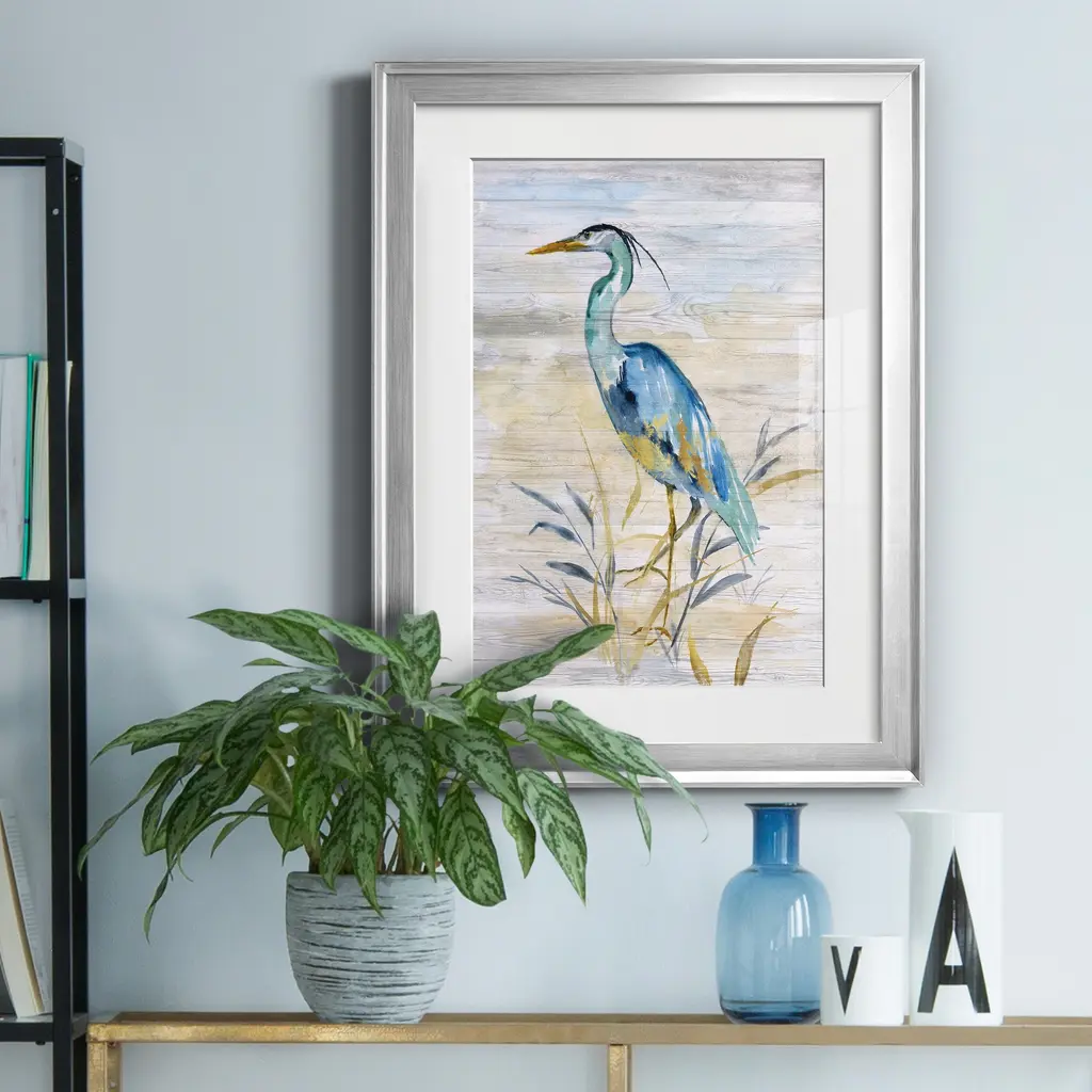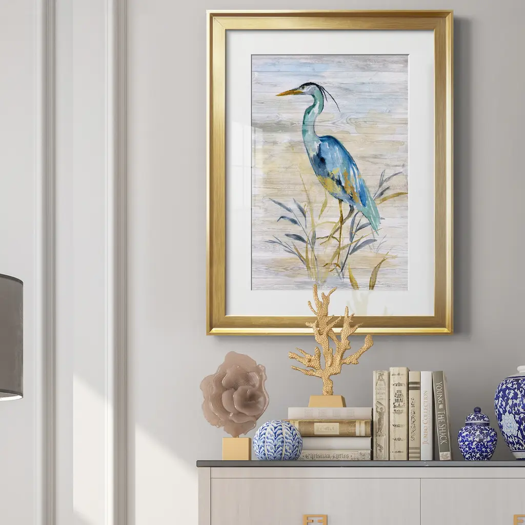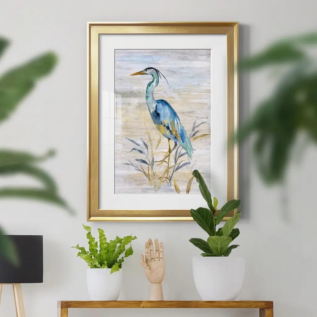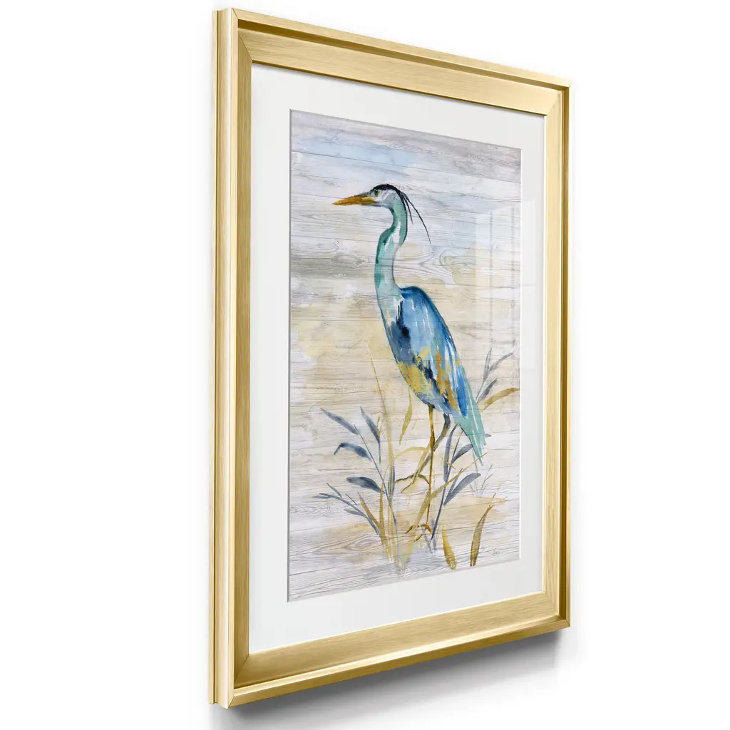 Blue Heron II Premium Framed Print - Ready to Hang A Premium Framed Print created to last. Framed in distressed wood and available in an array of sizes and colors Featuring a beveled a solid wood stretcher bar, each piece comes ready to hand 4 SIZES AVAILABLE 30.5''X42.5'' - Overall Size 26.5'X36.5'' - Overall Size 22''x30'' - Overall Size 18''x24'' - Overall Size Each piece is made to order. Each piece comes with hanging hardware. Made in the USA Ready to Hang Giclee Paper Print Acrylic Glass Beveled Matt Board