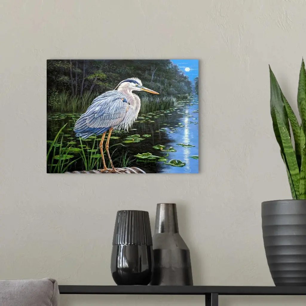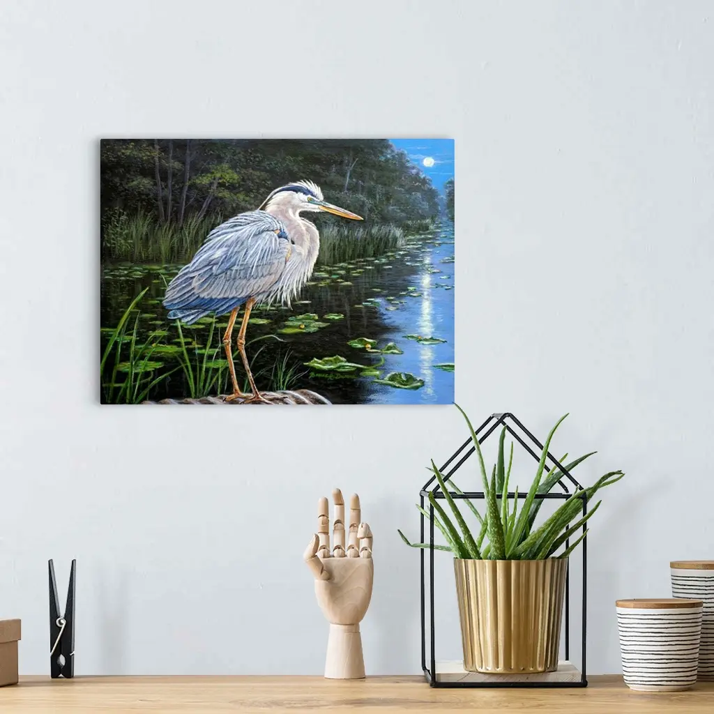 Painting of a Great Blue Heron standing on the edge of a pond with moonlight reflecting off the water.