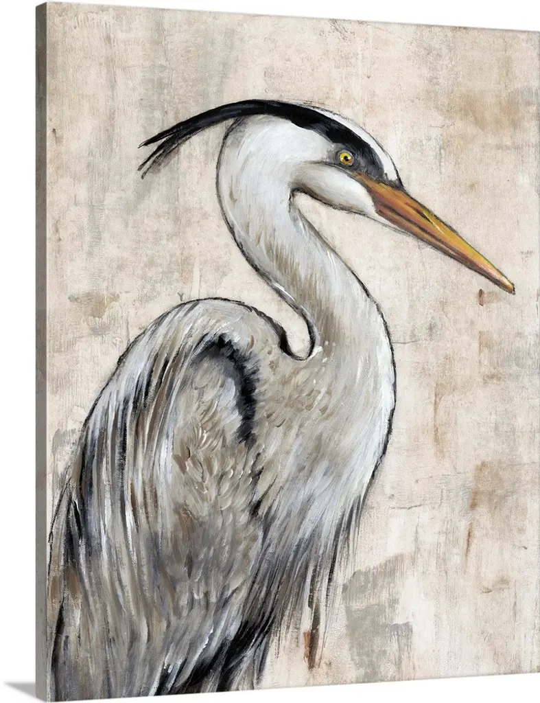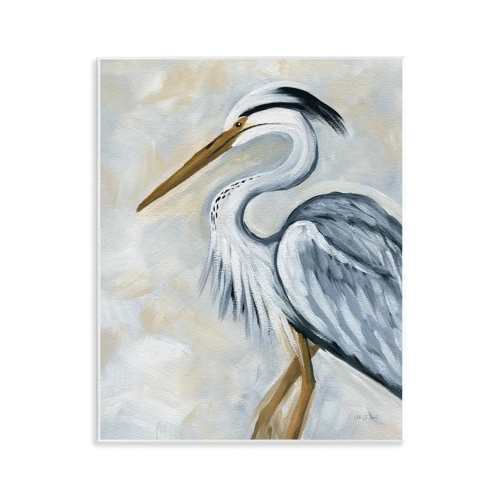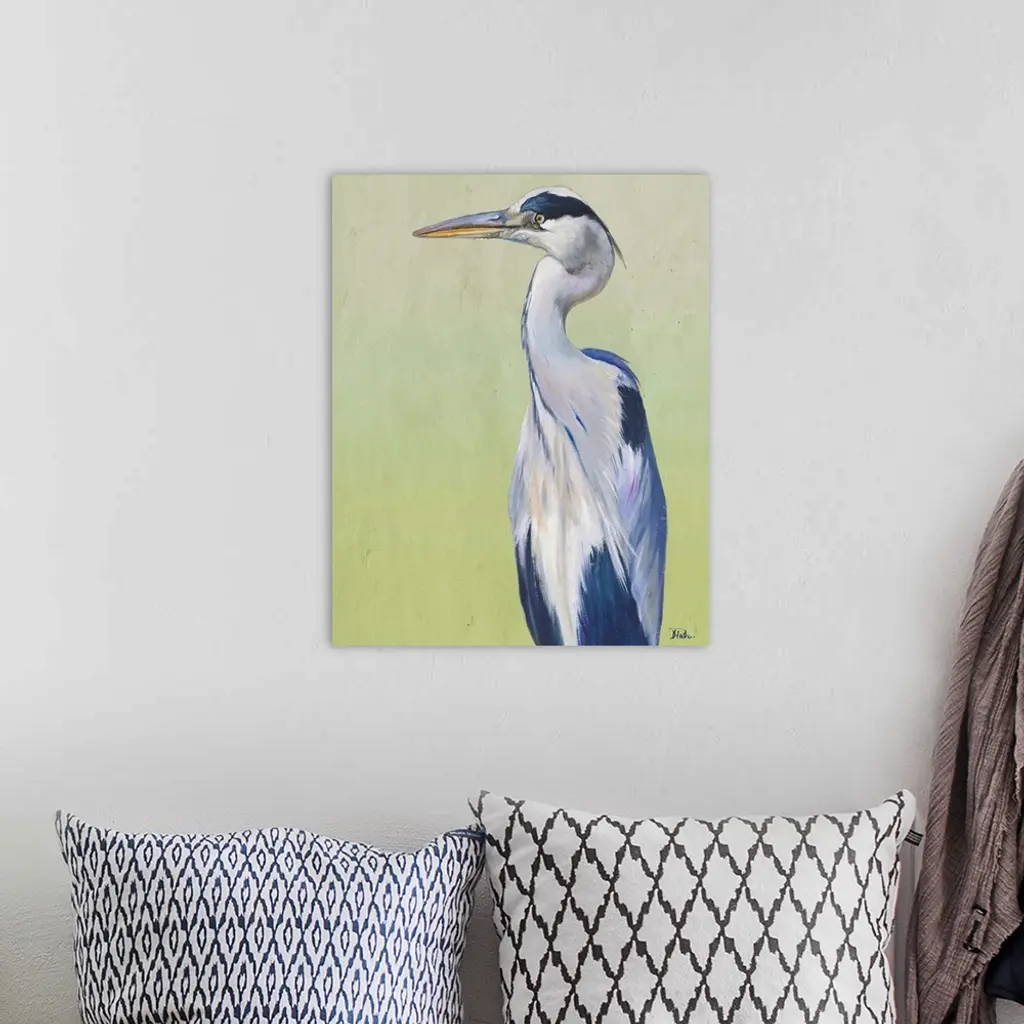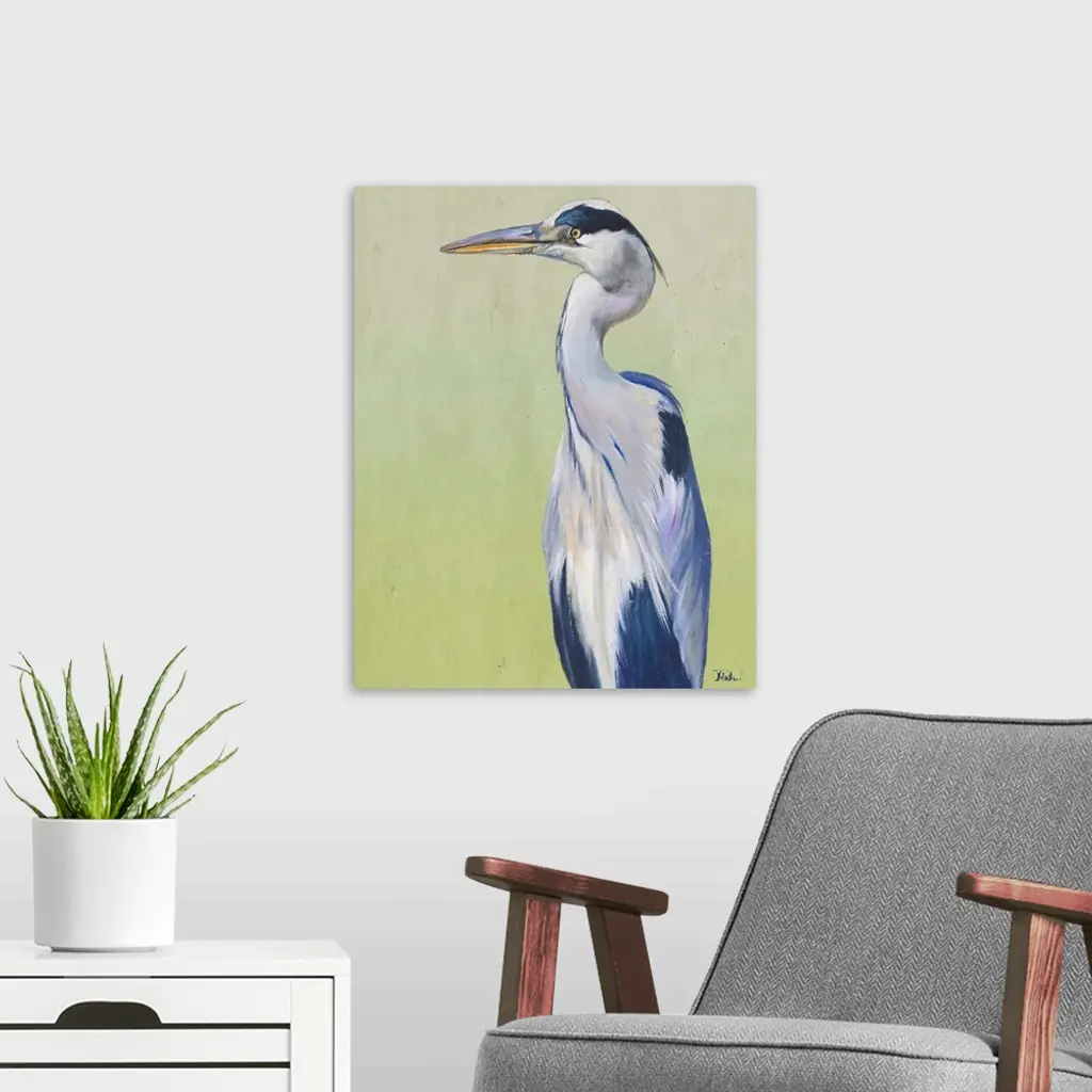 Contemporary painting of a Great Blue Heron against a pale green background.