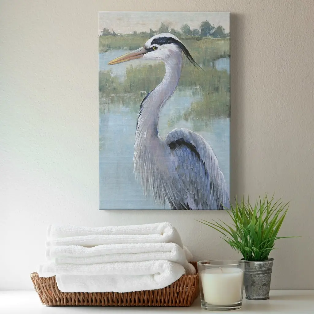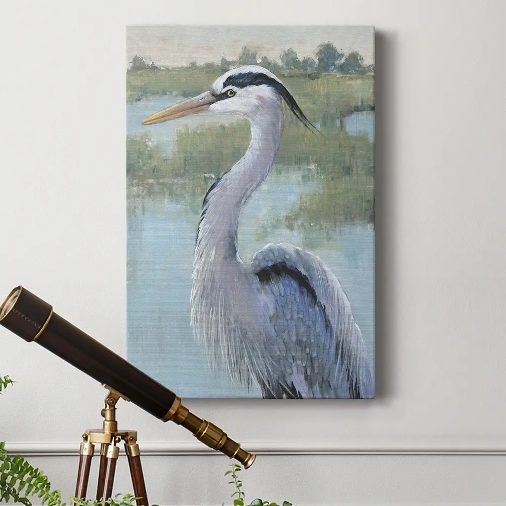Blue Heron Portrait I Premium Gallery Wrapped Canvas - Ready to Hang A premium hand stretched gallery wrapped canvas print created to last. Featuring a beveled a solid wood stretcher bar, each piece comes ready to hand 6 SIZES AVAILABLE 8''X12'' - Overall Size 12''X18'' - Overall Size 18''X27'' - Overall Size 24''x36'' - Overall Size 32''x48'' - Overall Size 40''x60'' - Overall Size Each piece is made to order. Built to Last Each piece comes ready to hang Solid wood stretcher Fade and Water resistant Made domestically