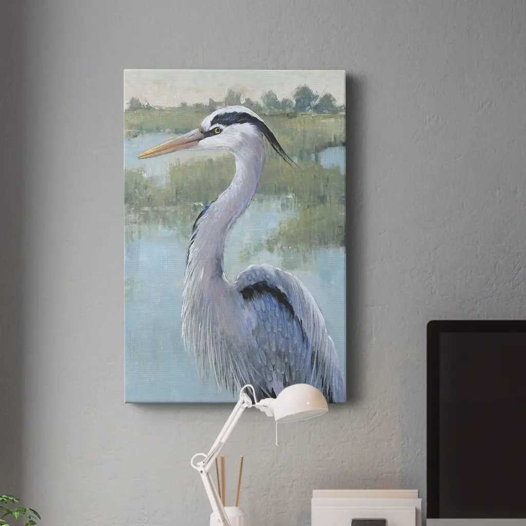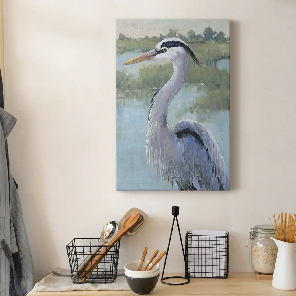 Blue Heron Portrait I Premium Gallery Wrapped Canvas - Ready to Hang A premium hand stretched gallery wrapped canvas print created to last. Featuring a beveled a solid wood stretcher bar, each piece comes ready to hand 6 SIZES AVAILABLE 8''X12'' - Overall Size 12''X18'' - Overall Size 18''X27'' - Overall Size 24''x36'' - Overall Size 32''x48'' - Overall Size 40''x60'' - Overall Size Each piece is made to order. Built to Last Each piece comes ready to hang Solid wood stretcher Fade and Water resistant Made domestically
