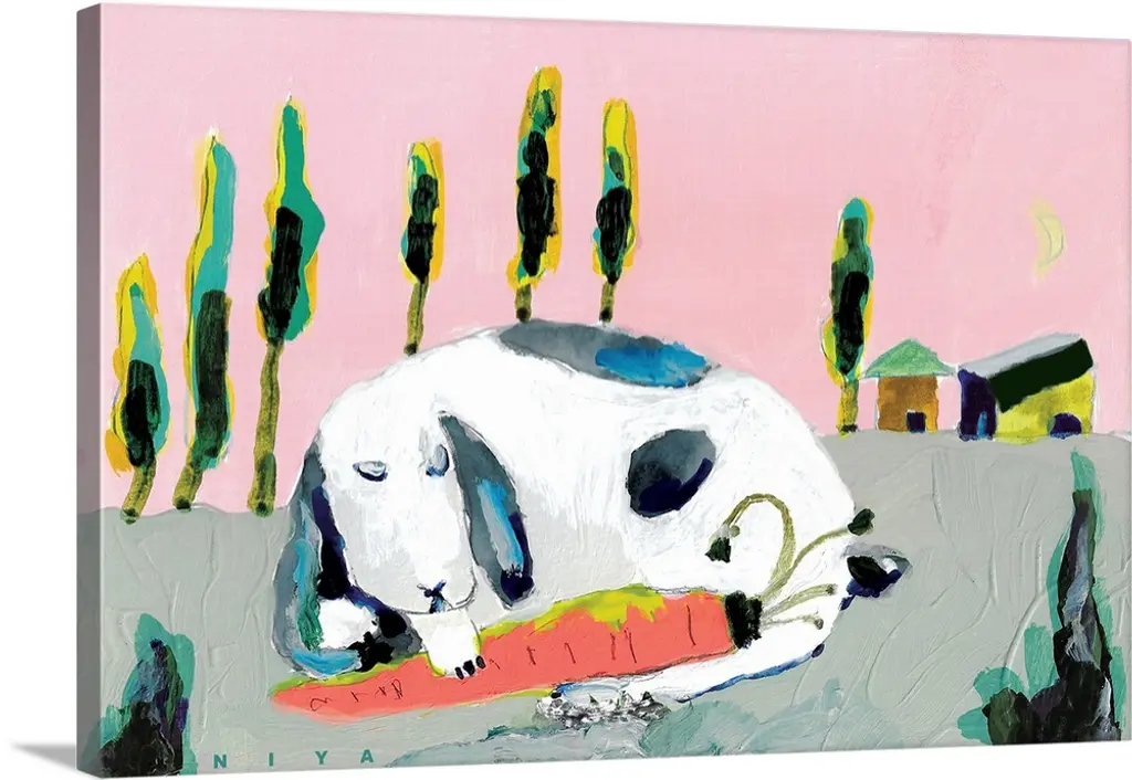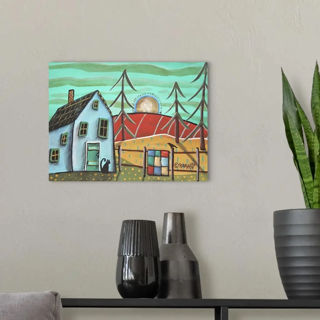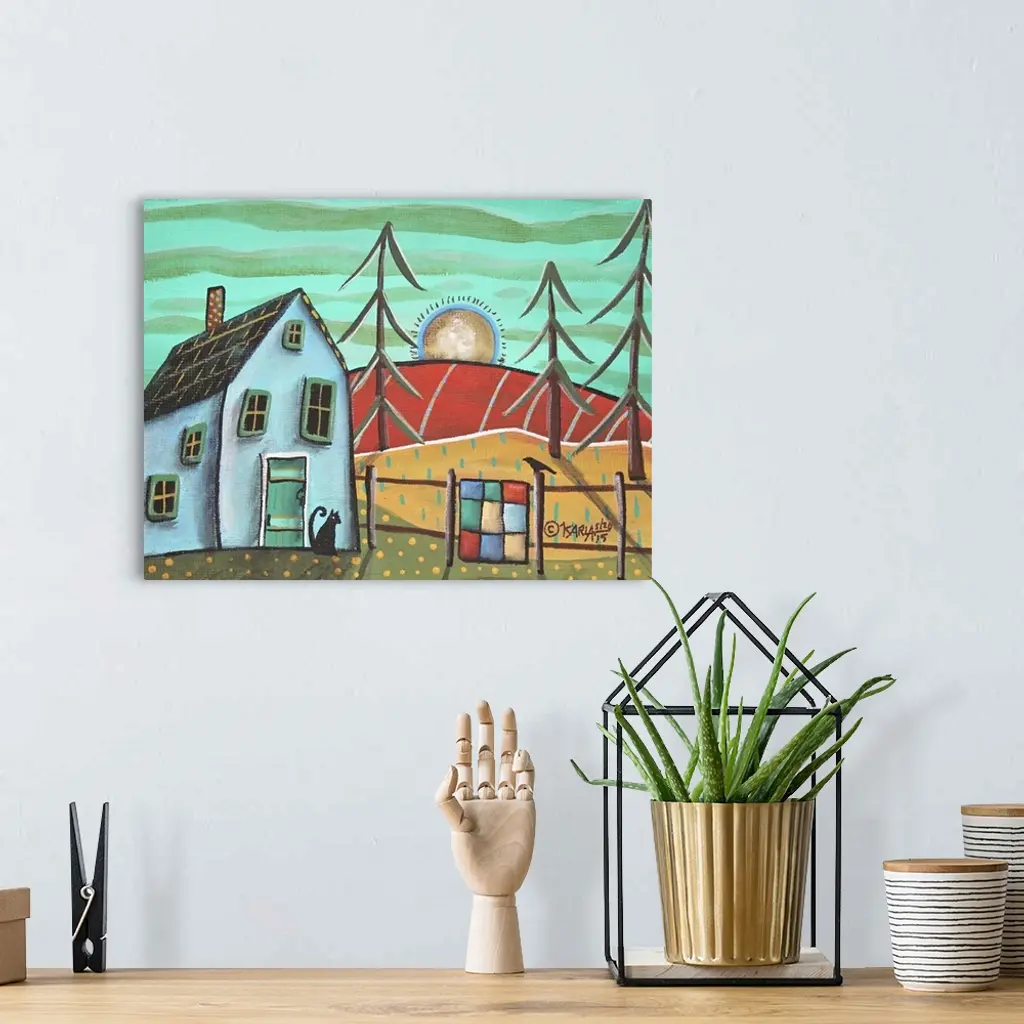 Contemporary folk-art style painting of a rolling hill landscape with houses and patchwork fields.