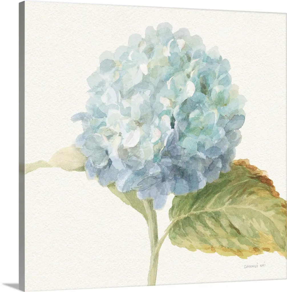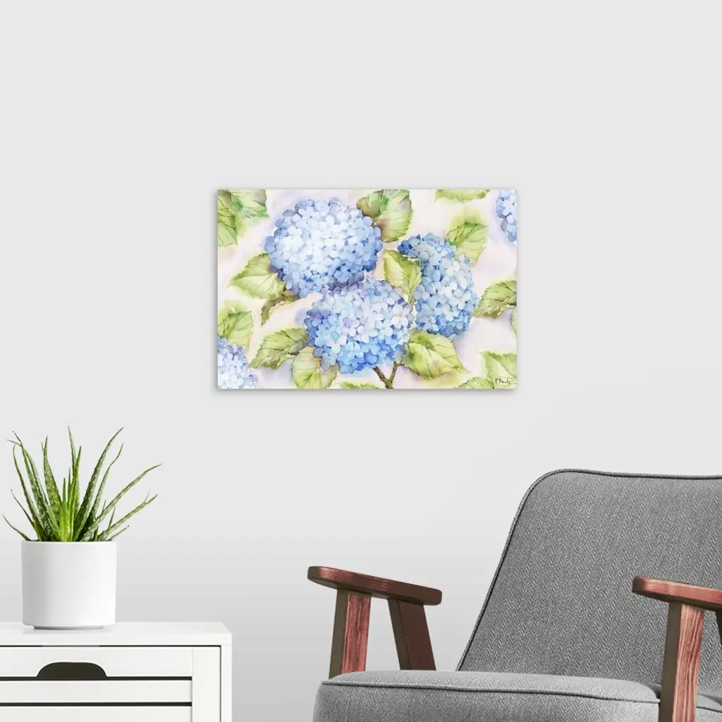 Large watercolor painting of blue hydrangeas and their green leaves on a white background.