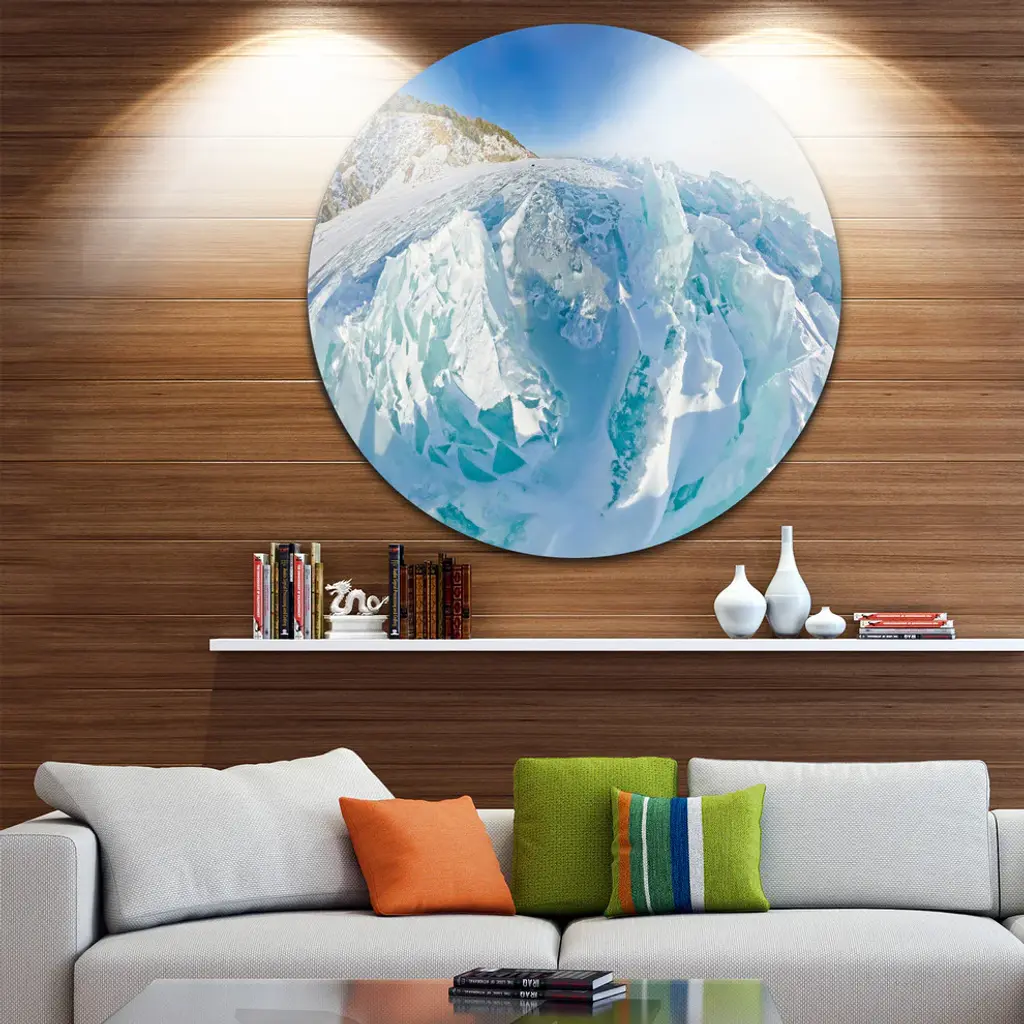 Bring Contemporary Abstraction to your home with this large Circle Metal wall art. This Blue Ice Mountains in Lake Baikal Siberia Metal Artwork makes it the focal point of any room or office. - White Gloss Coating ensures colors are extra vibrant with light reflection.- Aluminum grade Sheet Metal with 1 inch mounting frame on the back giving the illusion that the artwork is floating on the wall..- Mounting Brackets are included along with instructions.- High Quality Digital images are created directly into a glossy aluminum panel producing a stunning and captivating print into the glossy finish of the metal.- Water, Fire and Scratch resistant HD Aluminum panels.- Looks better than any photo paper and guaranteed to last at least 20 years- Easy to clean with a microfiber cloth. Colors are far superior to regular Canvas Art. - Easy to Hang