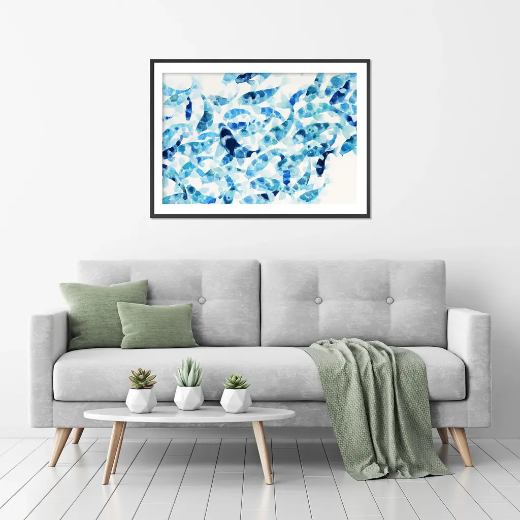 Mosaic shades of blue resemble small glimmering fish swimming across this horizontal abstract art. The decorative Norman Wyatt artwork, 'Blue Koi' will complement your space with its coastal and contemporary aesthetic.This piece is handcrafted in Chattanooga, Tennessee by Ready2HangArt using a locally sourced artist print, with a frame and a rear hanger for simple installation. Offering a wide range of transitional subjects and unique textures, Norman Wyatt's collections will add interest to any modern or contemporary decor.
