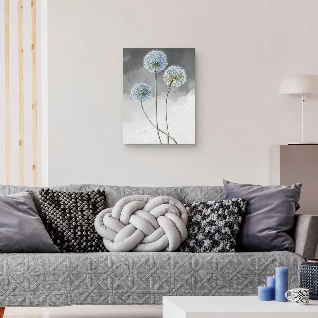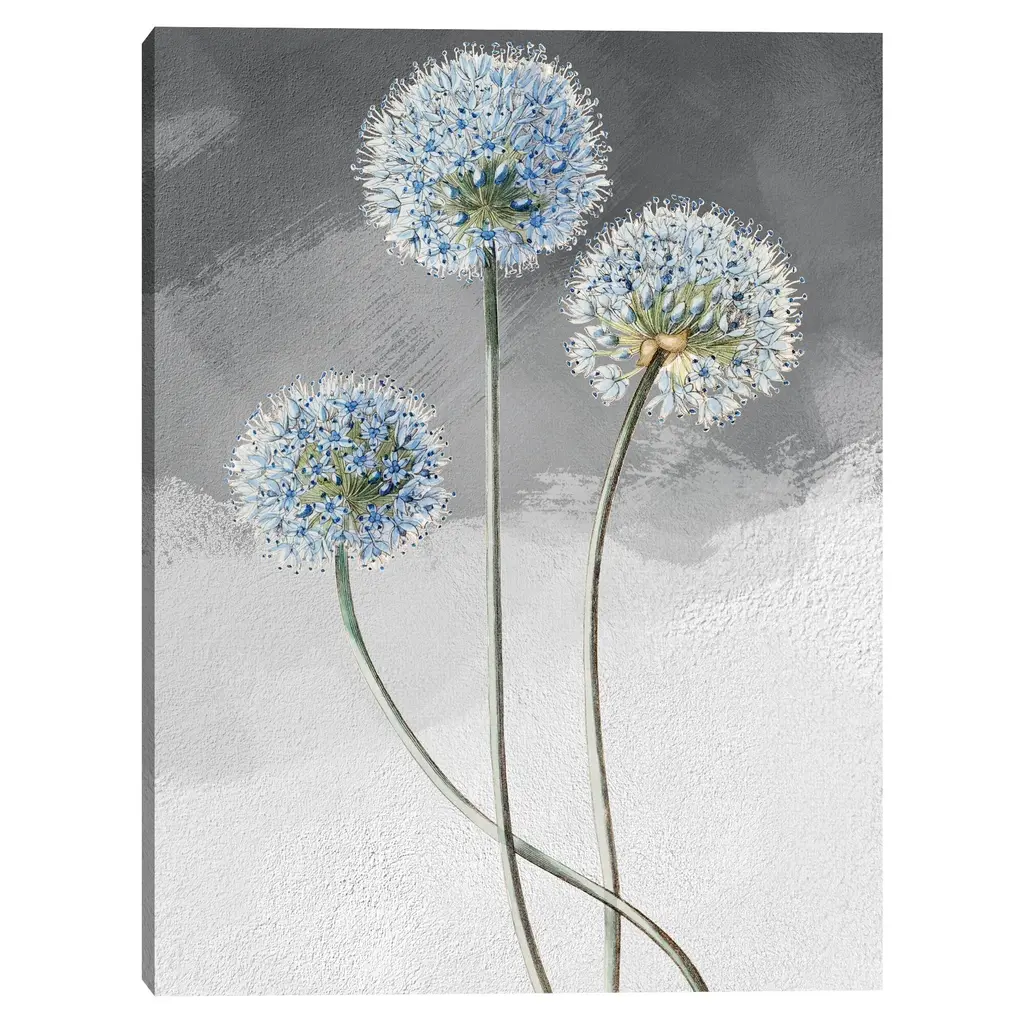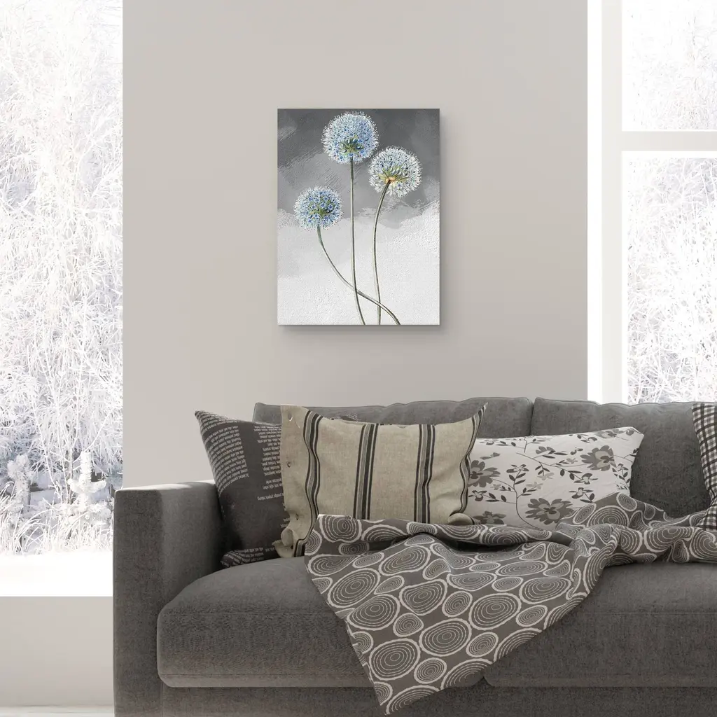 The fragile dandelion presented in light blue hues sways in the winds of an imminent cyclone, as told by menacing grey clouds. The three seedheads seek comfort from each other. Coax out the hidden style and beauty in your home with Design Lab's Blue Leek Grey canvas art print.