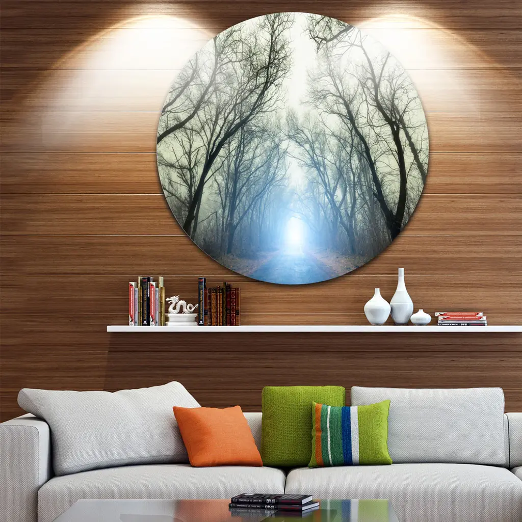 Bring Contemporary Abstraction to your home with this large Circle Metal wall art. This Blue Light in Foggy Autumn Metal Artwork makes it the focal point of any room or office. - White Gloss Coating ensures colors are extra vibrant with light reflection.- Aluminum grade Sheet Metal with 1 inch mounting frame on the back giving the illusion that the artwork is floating on the wall..- Mounting Brackets are included along with instructions.- High Quality Digital images are created directly into a glossy aluminum panel producing a stunning and captivating print into the glossy finish of the metal.- Water, Fire and Scratch resistant HD Aluminum panels.- Looks better than any photo paper and guaranteed to last at least 20 years- Easy to clean with a microfiber cloth. Colors are far superior to regular Canvas Art. - Easy to Hang