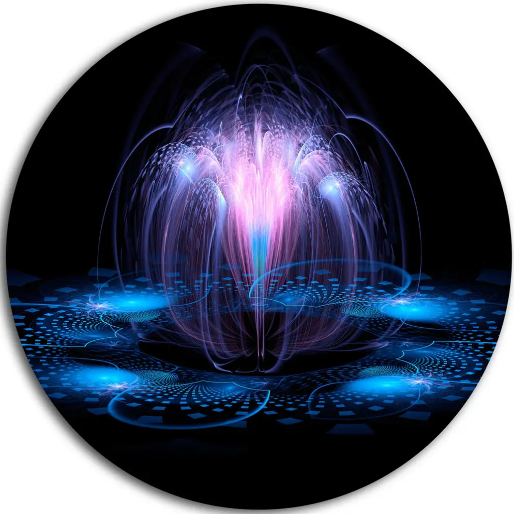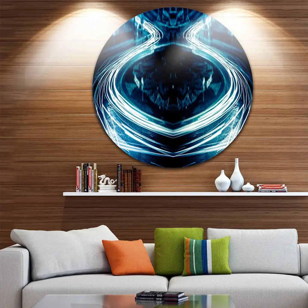 Bring Contemporary Abstraction to your home with this large Circle Metal wall art. This Blue Light Trails Metal Artwork makes it the focal point of any room or office. - White Gloss Coating ensures colors are extra vibrant with light reflection.- Aluminum grade Sheet Metal with 1 inch mounting frame on the back giving the illusion that the artwork is floating on the wall..- Mounting Brackets are included along with instructions.- High Quality Digital images are created directly into a glossy aluminum panel producing a stunning and captivating print into the glossy finish of the metal.- Water, Fire and Scratch resistant HD Aluminum panels.- Looks better than any photo paper and guaranteed to last at least 20 years- Easy to clean with a microfiber cloth. Colors are far superior to regular Canvas Art. - Easy to Hang