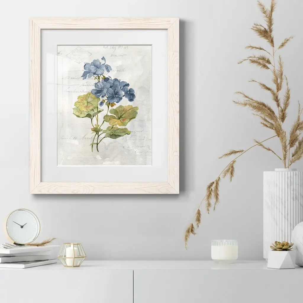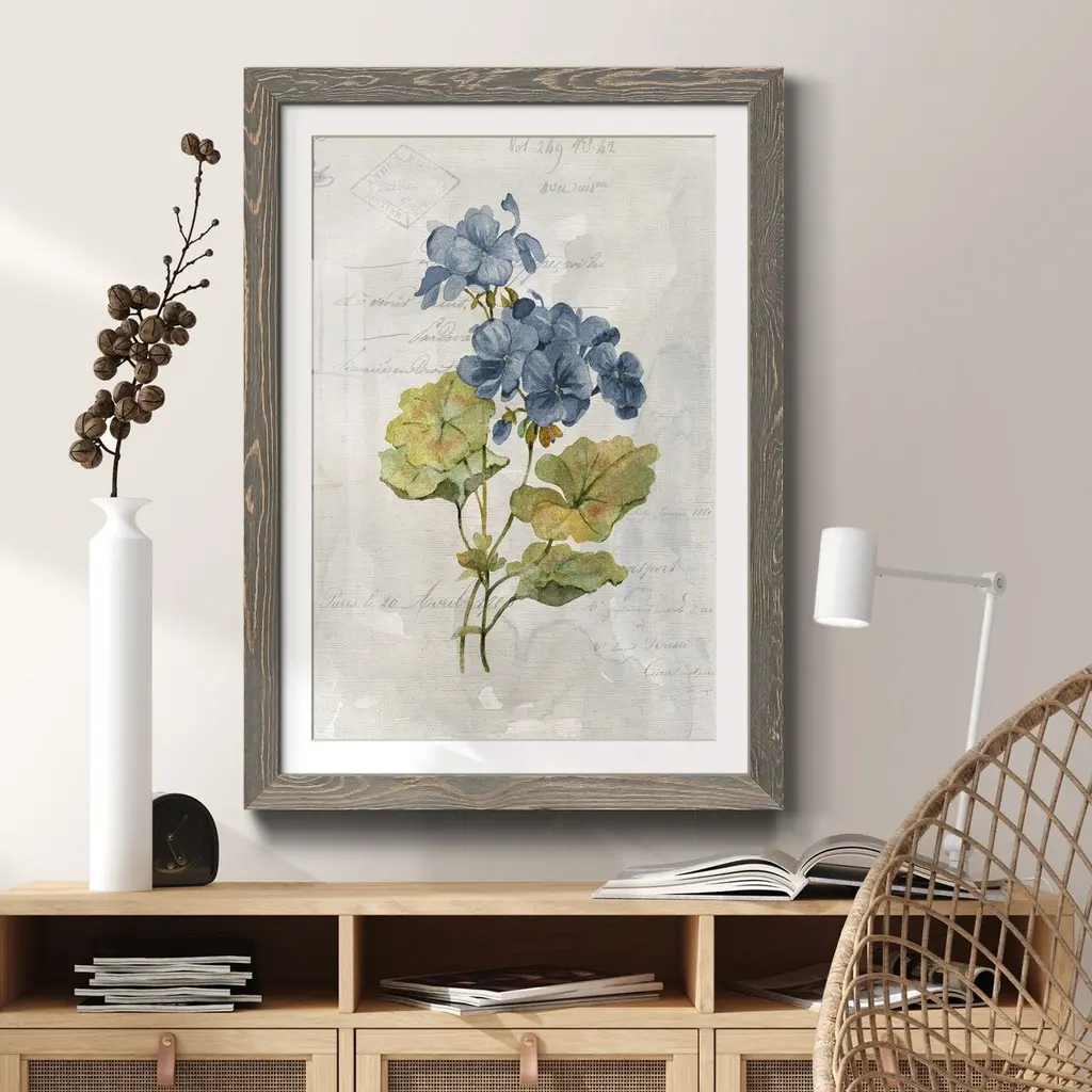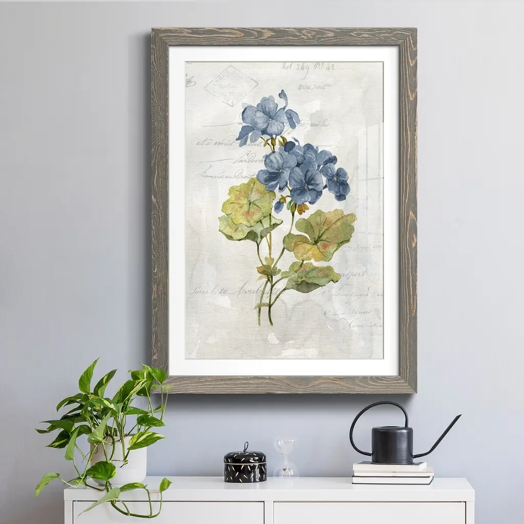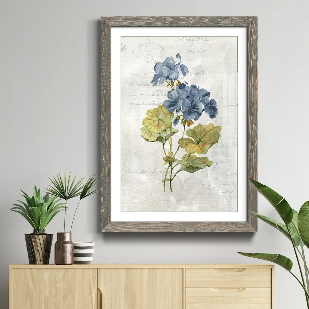 Blue Linen Geranium-Premium Framed Print - Ready to Hang Framed in distressed wood and available in an array of sizes and colors Each piece is joined and assembled by hand and comes ready to hang 2 INCH BEVELED MATTE BOARD PLEXIGLASS COVERING READY TO HANG MADE IN THE USA SOLID WOOD FRAME MADE IN USA FADE RESISTANT GICLEE PRINTING on Canvas or Paper
