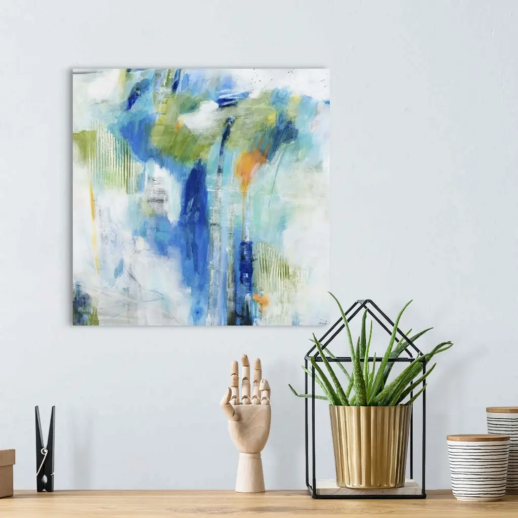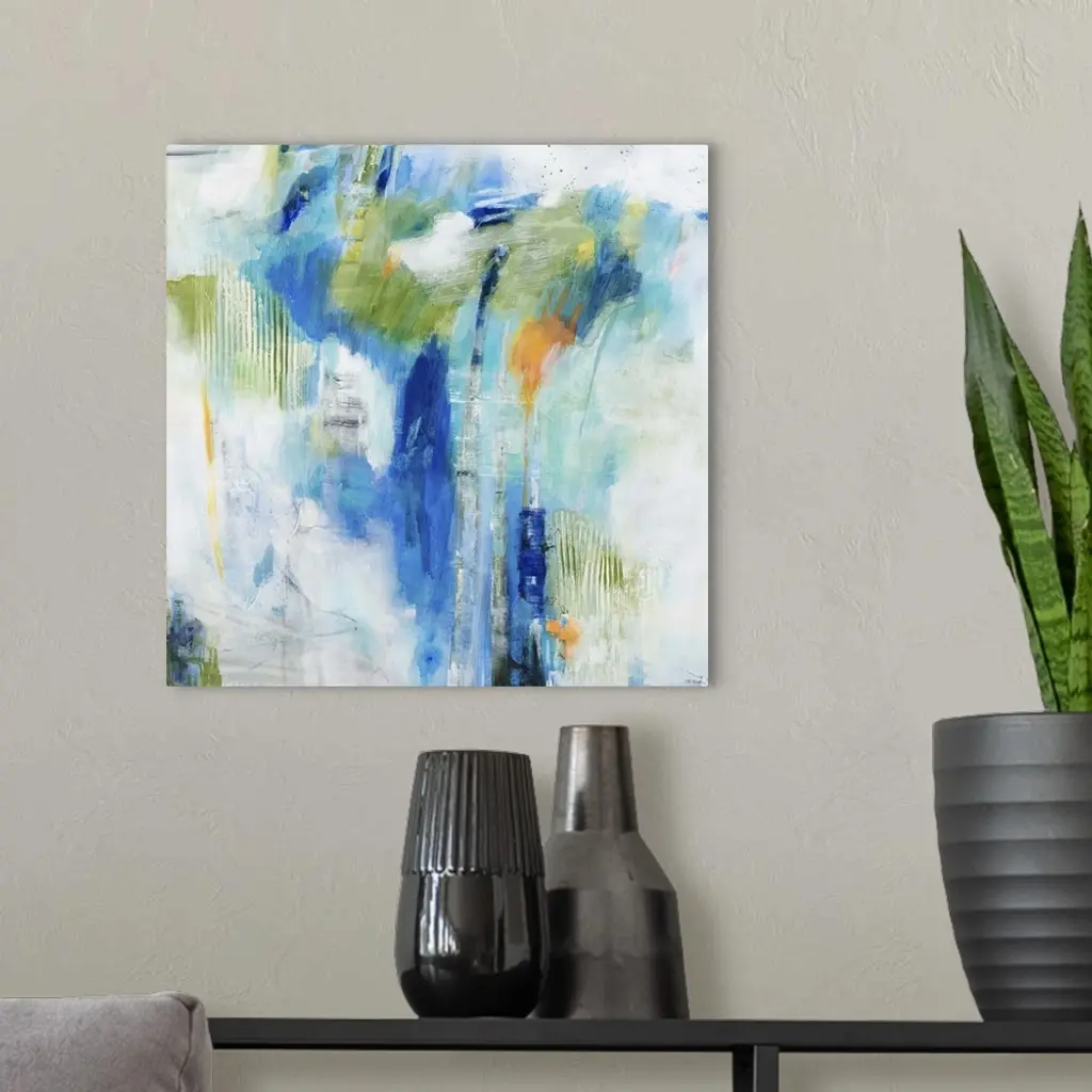 Contemporary abstract painting of splashes blue and green tones against a neutral background.