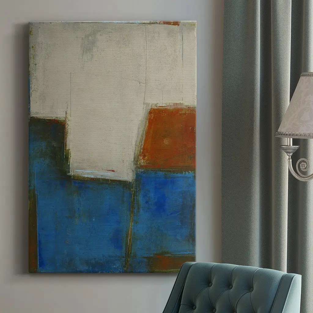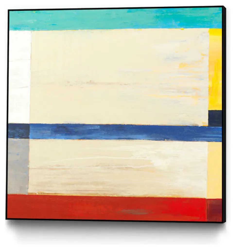 An ode to Piet Mondrian, the pioneer of 20th century abstract art and neoplasticism, our Blue Mood painting focuses on the two primary directions - horizontal and vertical - in order to create "universal beauty". Various hues of blue are accented with touches of gold to impart a serene feeling.