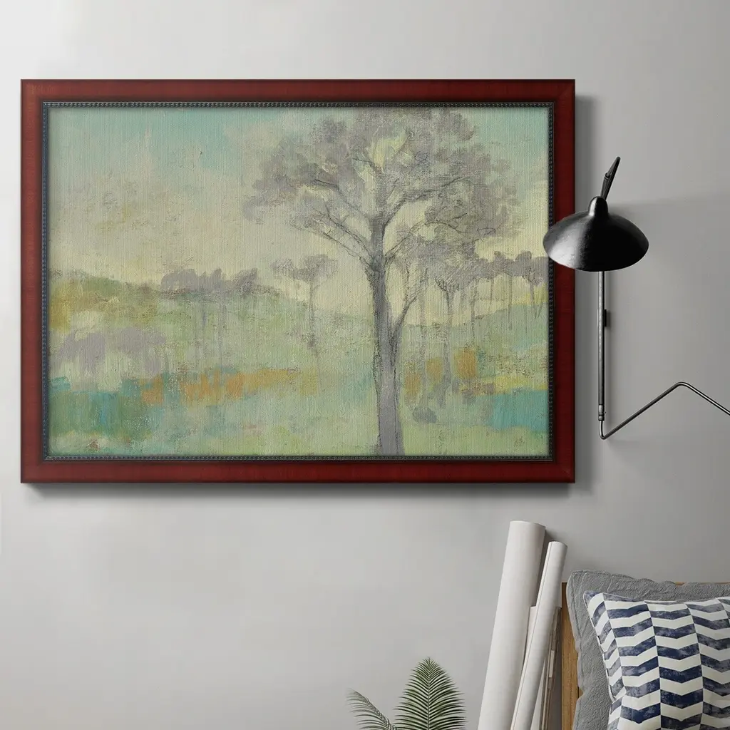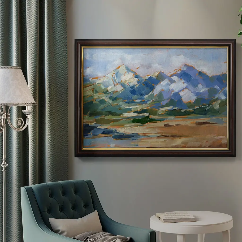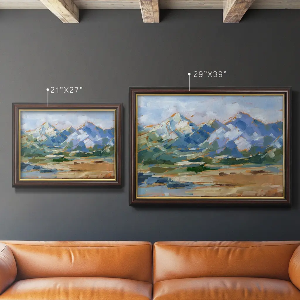 Blue Mountain Peaks II Premium Framed Canvas- Ready to Hang A Premium Framed Canvas created to last. Framed in distressed wood and available in an array of sizes and colors Featuring a beveled a solid wood stretcher bar, each piece comes ready to hand 3 SIZES AVAILABLE 16''X20'' - Overall Size 18'X27'' - Overall Size 24''x36'' - Overall Size Each piece is made to order. Each piece comes with hanging hardware. Made in the USA Ready to Hang Giclee Paper Print Acrylic Glass Beveled Matt Board