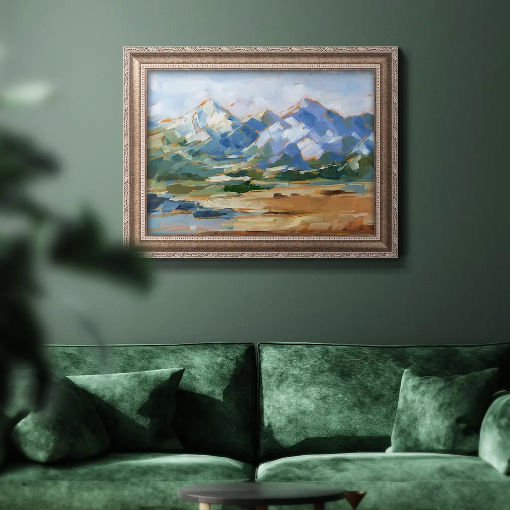Blue Mountain Peaks II Premium Framed Canvas- Ready to Hang A Premium Framed Canvas created to last. Framed in distressed wood and available in an array of sizes and colors Featuring a beveled a solid wood stretcher bar, each piece comes ready to hand 3 SIZES AVAILABLE 16''X20'' - Overall Size 18'X27'' - Overall Size 24''x36'' - Overall Size Each piece is made to order. Each piece comes with hanging hardware. Made in the USA Ready to Hang Giclee Paper Print Acrylic Glass Beveled Matt Board