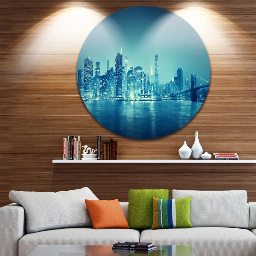 Bring Contemporary Abstraction to your home with this large Circle Metal wall art. This Blue New York at Night Metal Artwork makes it the focal point of any room or office. - White Gloss Coating ensures colors are extra vibrant with light reflection.- Aluminum grade Sheet Metal with 1 inch mounting frame on the back giving the illusion that the artwork is floating on the wall..- Mounting Brackets are included along with instructions.- High Quality Digital images are created directly into a glossy aluminum panel producing a stunning and captivating print into the glossy finish of the metal.- Water, Fire and Scratch resistant HD Aluminum panels.- Looks better than any photo paper and guaranteed to last at least 20 years- Easy to clean with a microfiber cloth. Colors are far superior to regular Canvas Art. - Easy to Hang