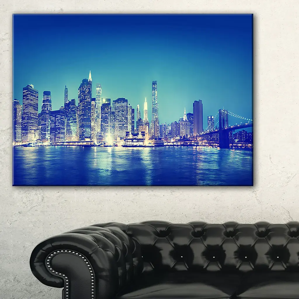The Blue New York City at Night Panorama canvas art print is sure to make an impression on anyone who sees it. This artwork is gallery wrapped around a 1-inch solid wood frame and arrives carefully packaged and entirely ready to hang on the wall. Design Art only uses the highest resolution and pigments to ensure a crisp colorful print that is never faded or pixelated. This artwork is sure to be a conversation starter in any home or office.