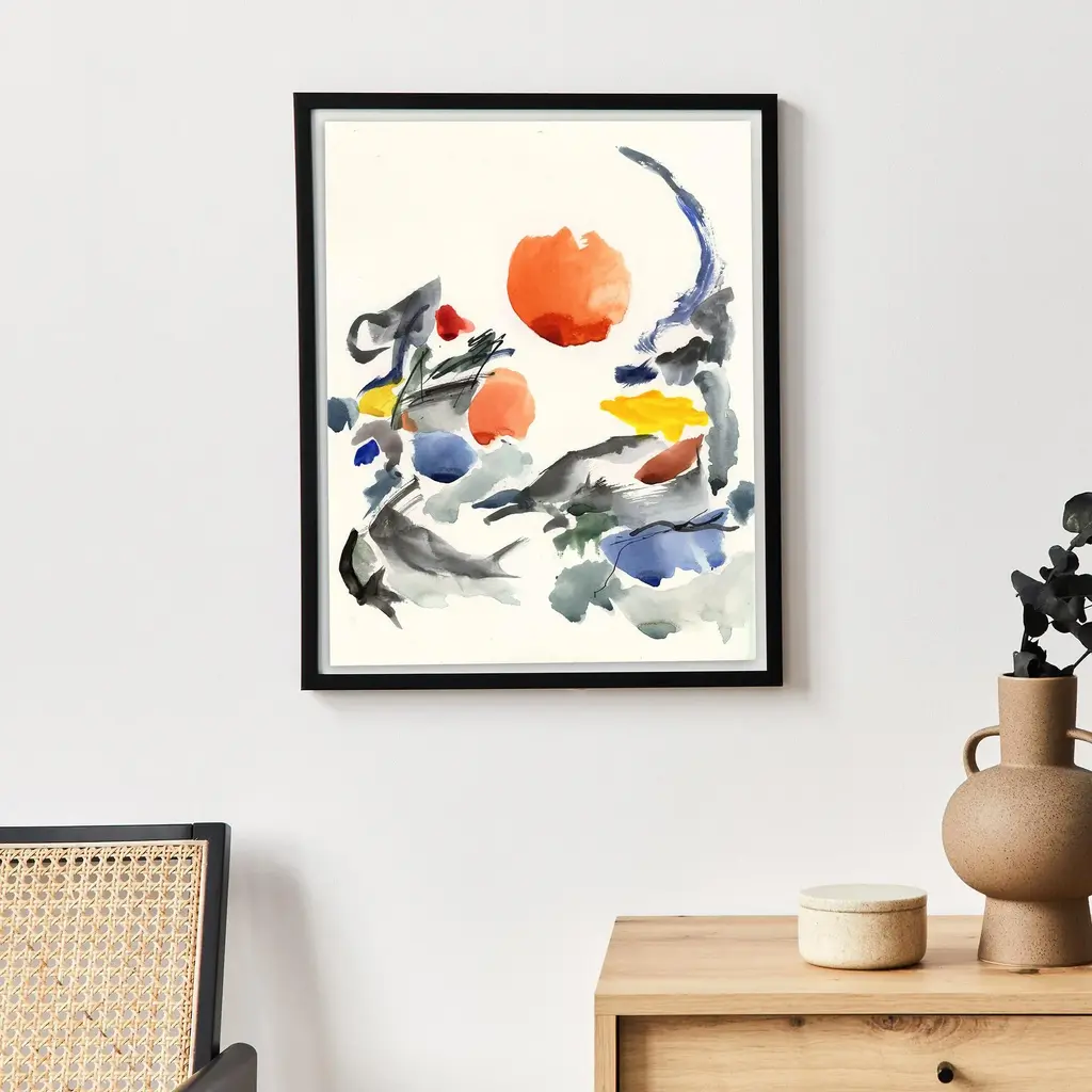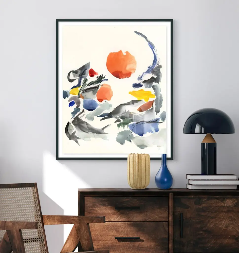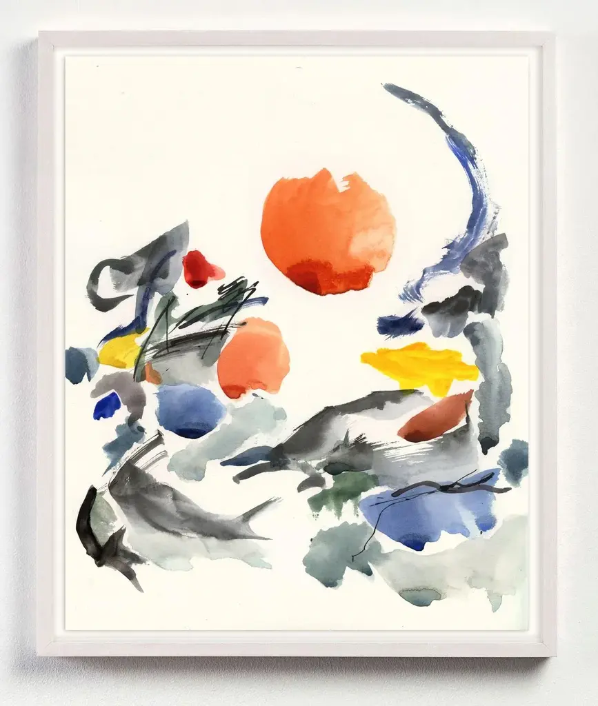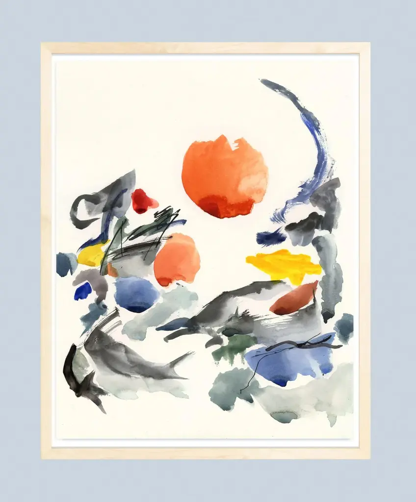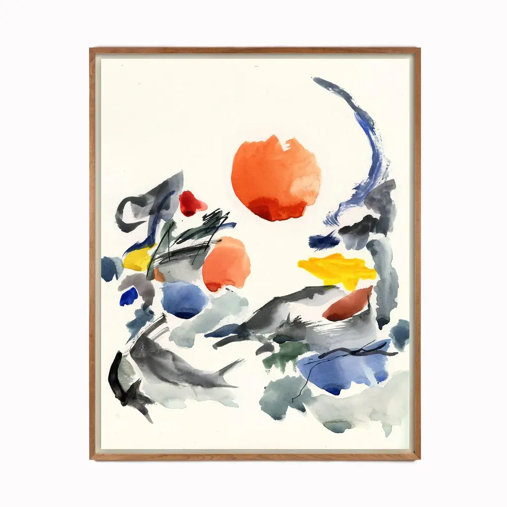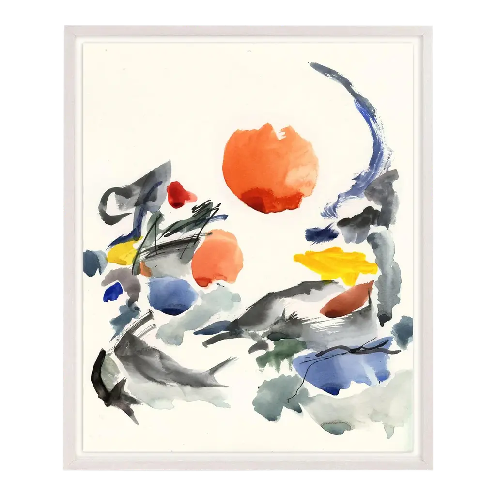 Based on an original watercolor in the Blue Notes series, "Blue Notes No. 5" has the energy of Mid-Century Abstraction and pulsing primary colors. Broad, quick brushstrokes and washy blends create a dynamic but sensual piece. Unframed Giclée pigment print on 100% Cotton Archival watercolor paper. Unframed prints are shipped in a heavyweight mailing tube.