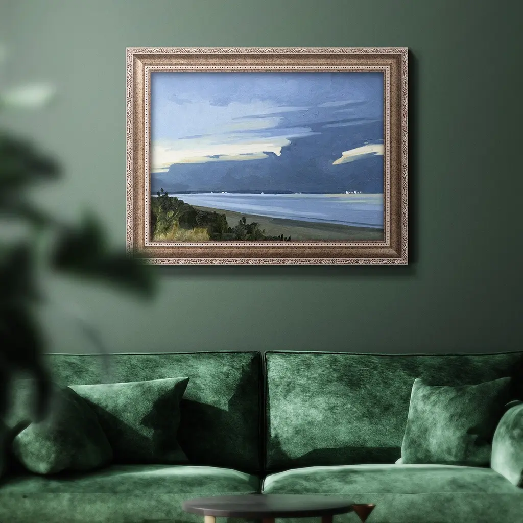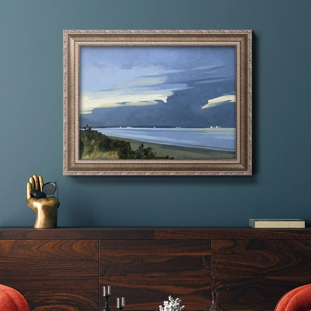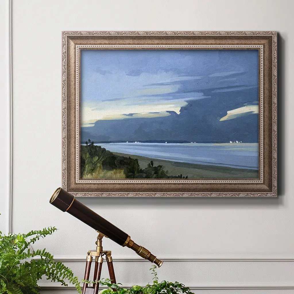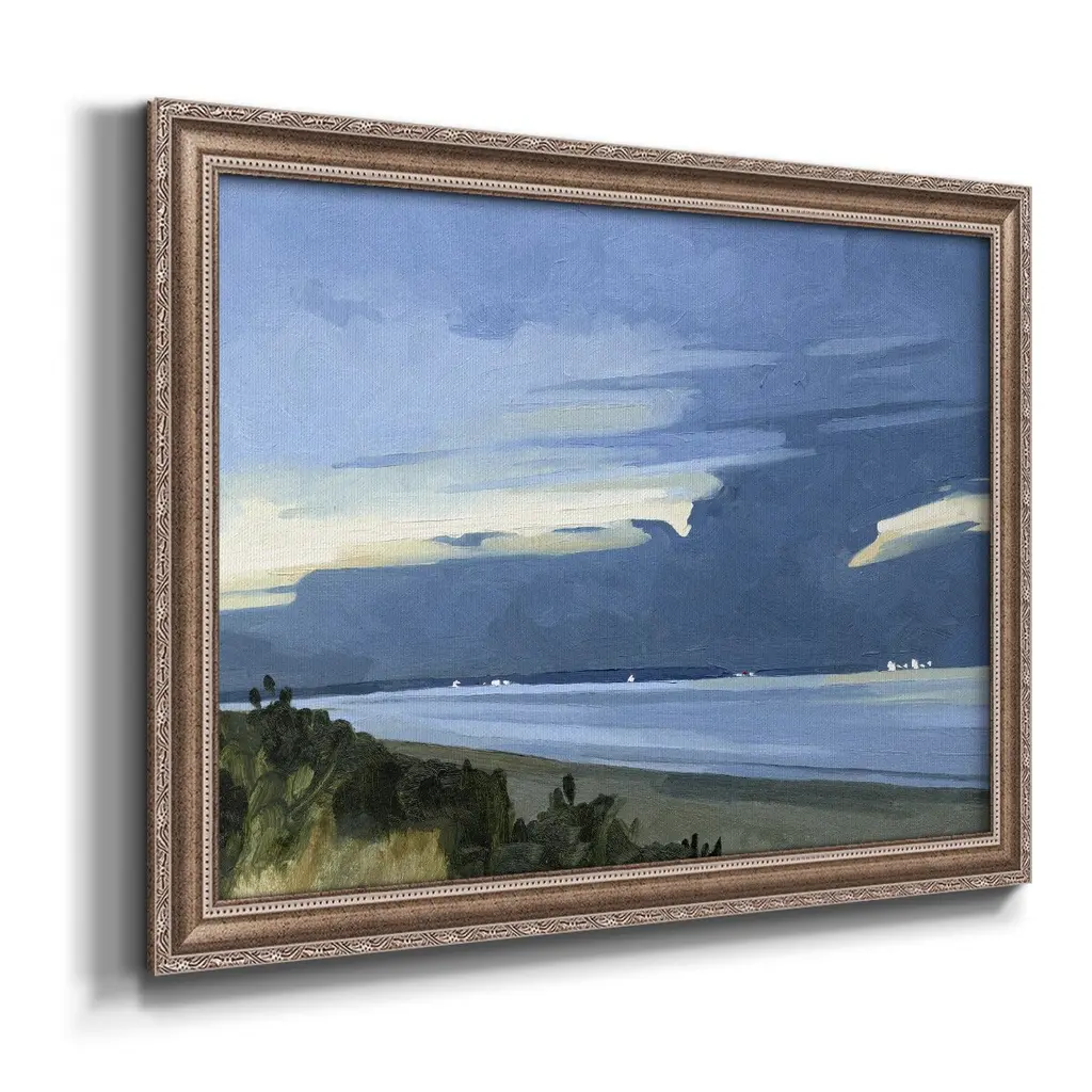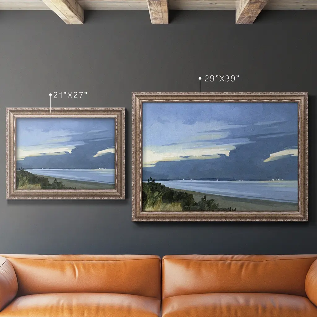 Blue Ocean Evening I Premium Framed Canvas- Ready to Hang A Premium Framed Canvas created to last. Framed in distressed wood and available in an array of sizes and colors Featuring a beveled a solid wood stretcher bar, each piece comes ready to hand 3 SIZES AVAILABLE 16''X20'' - Overall Size 18'X27'' - Overall Size 24''x36'' - Overall Size Each piece is made to order. Each piece comes with hanging hardware. Made in the USA Ready to Hang Giclee Paper Print Acrylic Glass Beveled Matt Board