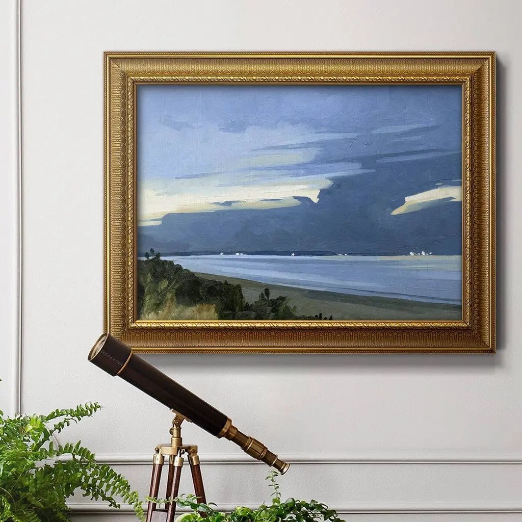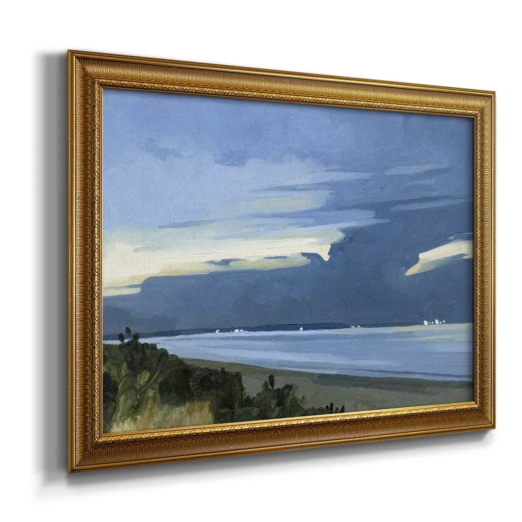 Blue Ocean Evening I Premium Framed Canvas- Ready to Hang A Premium Framed Canvas created to last. Framed in distressed wood and available in an array of sizes and colors Featuring a beveled a solid wood stretcher bar, each piece comes ready to hand 3 SIZES AVAILABLE 16''X20'' - Overall Size 18'X27'' - Overall Size 24''x36'' - Overall Size Each piece is made to order. Each piece comes with hanging hardware. Made in the USA Ready to Hang Giclee Paper Print Acrylic Glass Beveled Matt Board