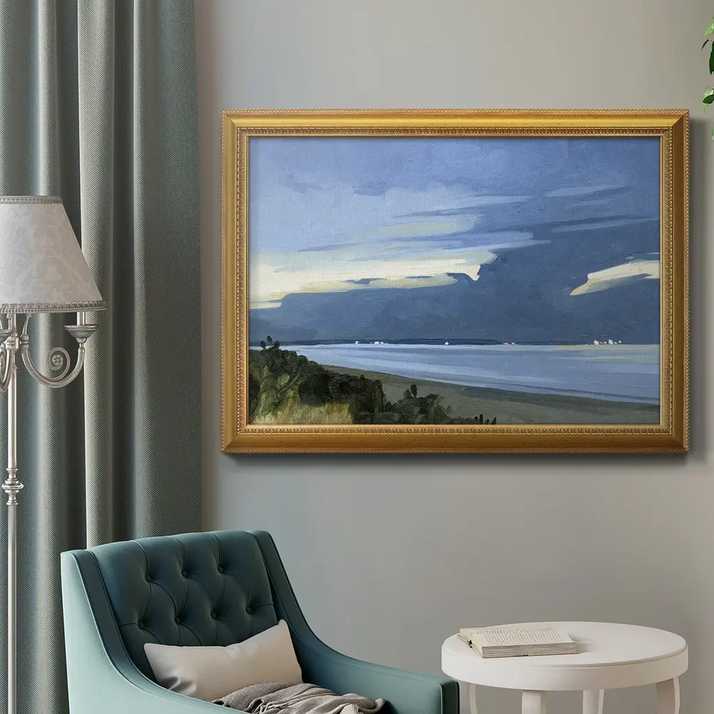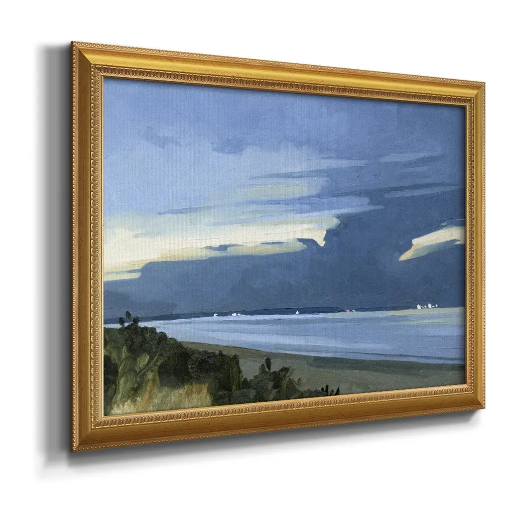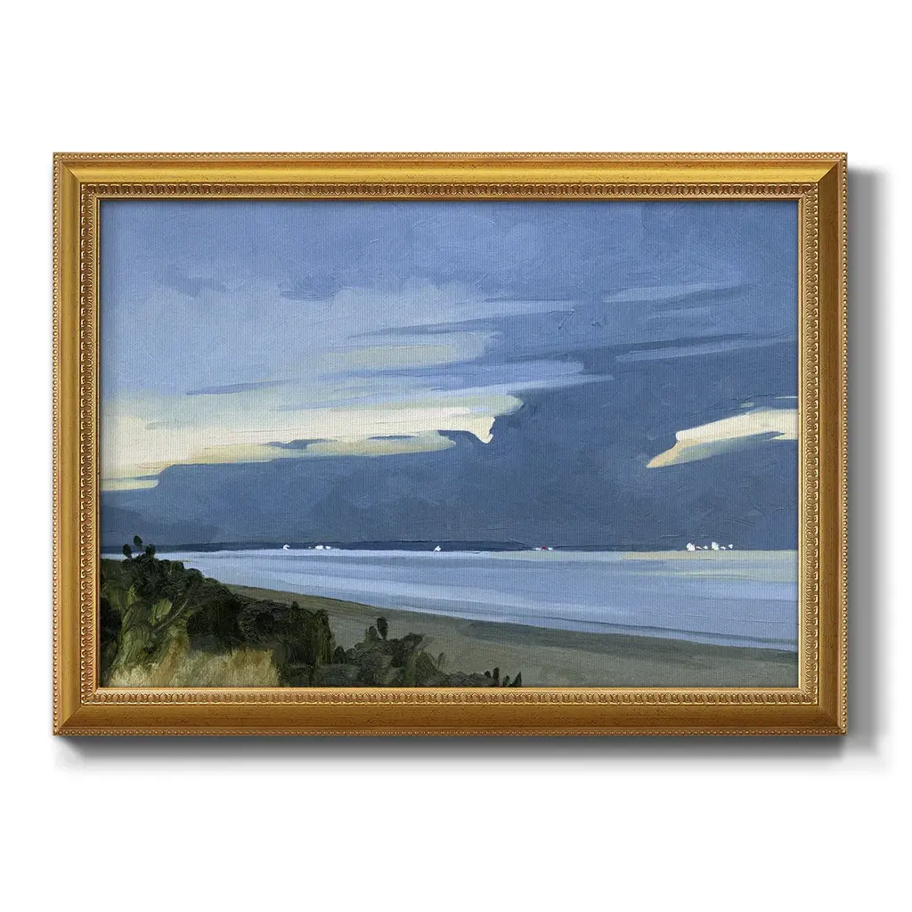 Blue Ocean Evening I Premium Framed Canvas- Ready to Hang A Premium Framed Canvas created to last. Framed in distressed wood and available in an array of sizes and colors Featuring a beveled a solid wood stretcher bar, each piece comes ready to hand 3 SIZES AVAILABLE 16''X20'' - Overall Size 18'X27'' - Overall Size 24''x36'' - Overall Size Each piece is made to order. Each piece comes with hanging hardware. Made in the USA Ready to Hang Giclee Paper Print Acrylic Glass Beveled Matt Board