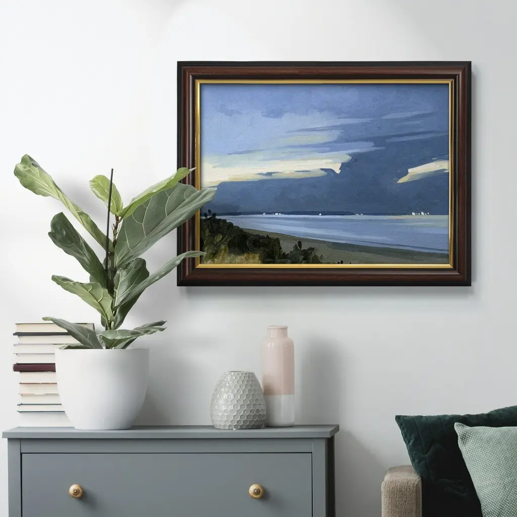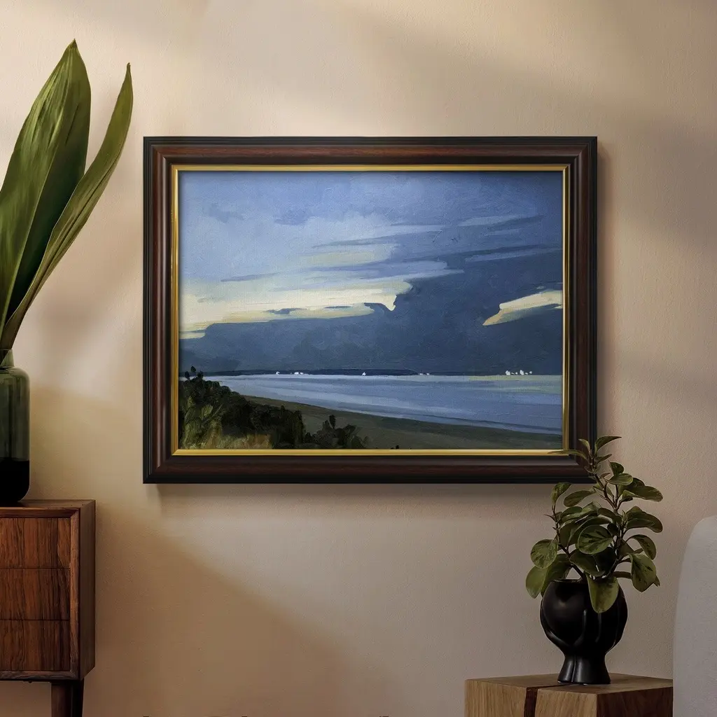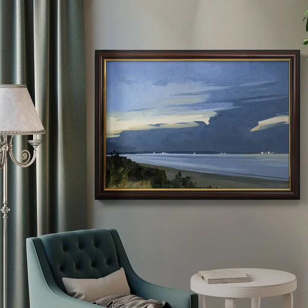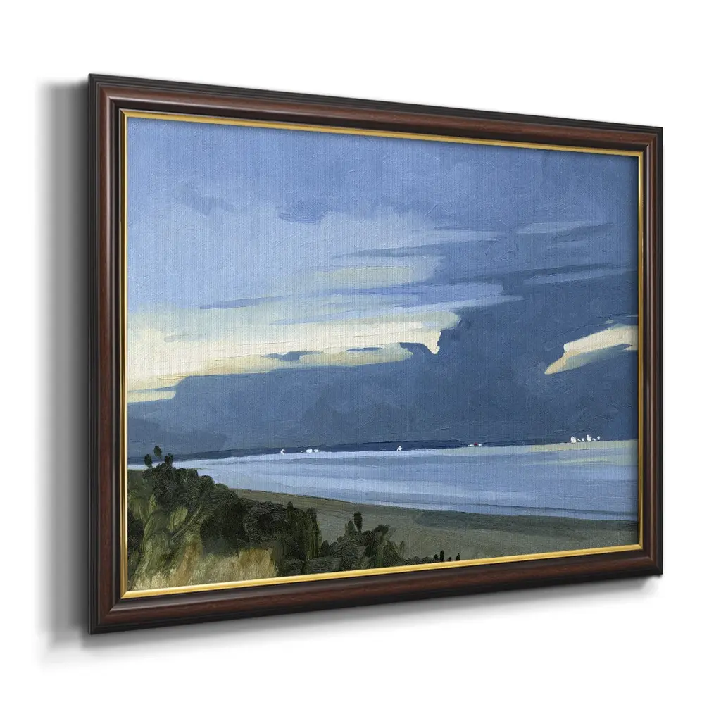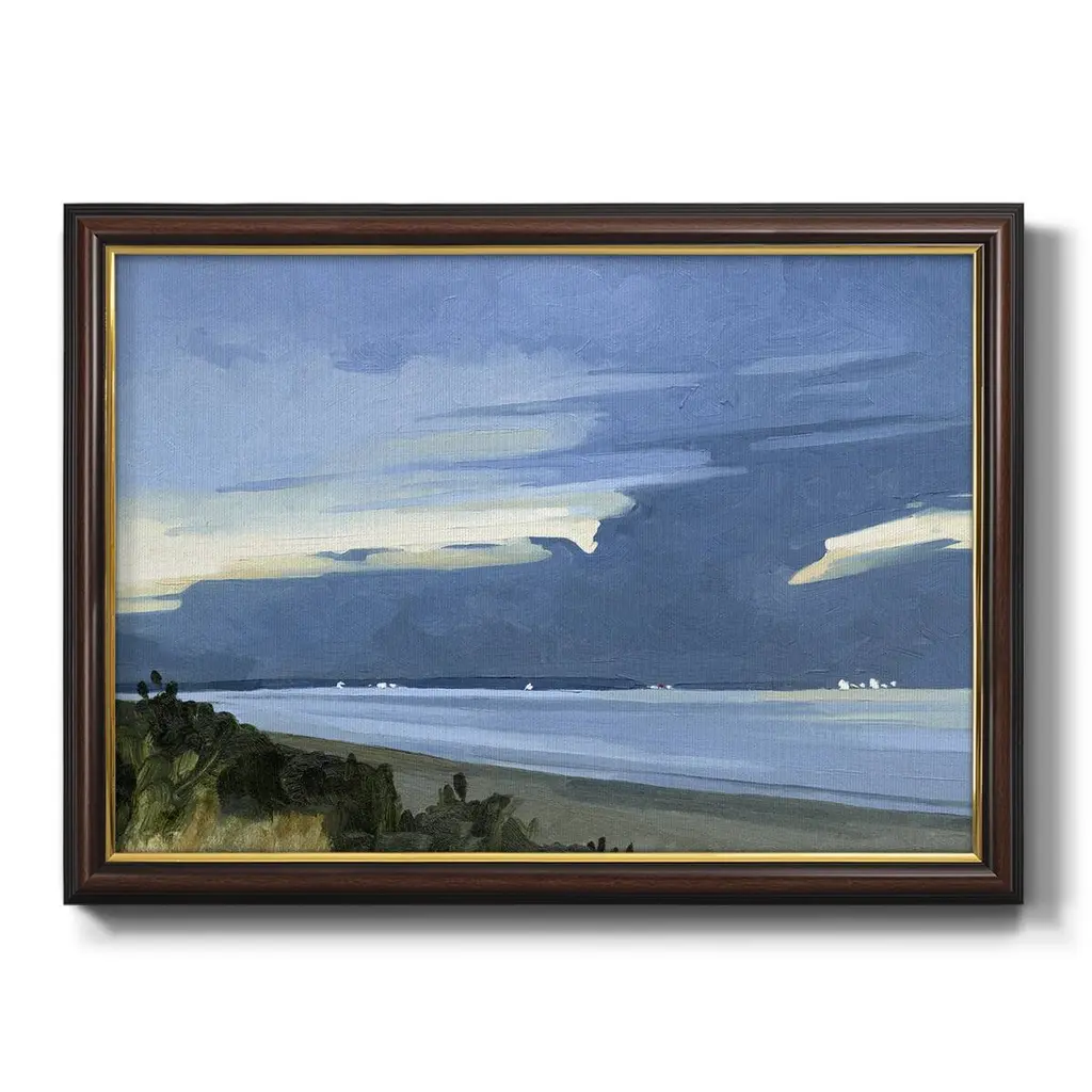 Blue Ocean Evening I Premium Framed Canvas- Ready to Hang A Premium Framed Canvas created to last. Framed in distressed wood and available in an array of sizes and colors Featuring a beveled a solid wood stretcher bar, each piece comes ready to hand 3 SIZES AVAILABLE 16''X20'' - Overall Size 18'X27'' - Overall Size 24''x36'' - Overall Size Each piece is made to order. Each piece comes with hanging hardware. Made in the USA Ready to Hang Giclee Paper Print Acrylic Glass Beveled Matt Board