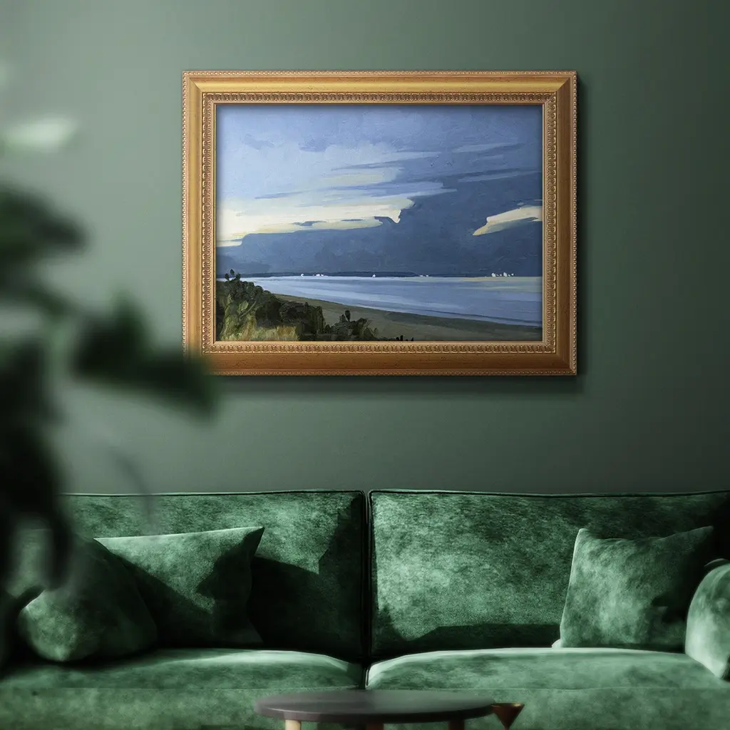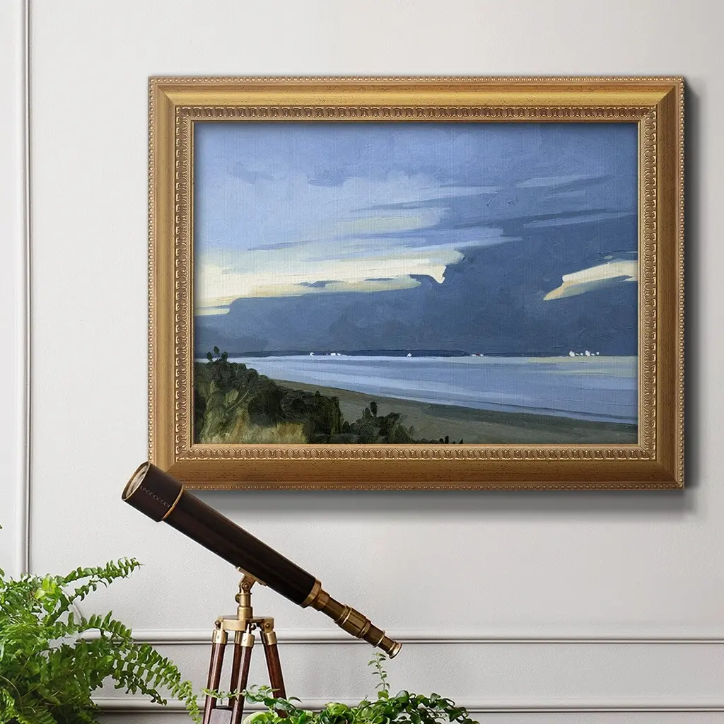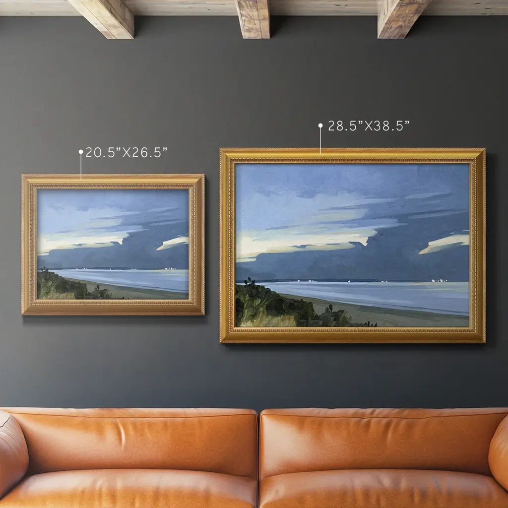 Blue Ocean Evening I Premium Framed Canvas- Ready to Hang A Premium Framed Canvas created to last. Framed in distressed wood and available in an array of sizes and colors Featuring a beveled a solid wood stretcher bar, each piece comes ready to hand 3 SIZES AVAILABLE 16''X20'' - Overall Size 18'X27'' - Overall Size 24''x36'' - Overall Size Each piece is made to order. Each piece comes with hanging hardware. Made in the USA Ready to Hang Giclee Paper Print Acrylic Glass Beveled Matt Board