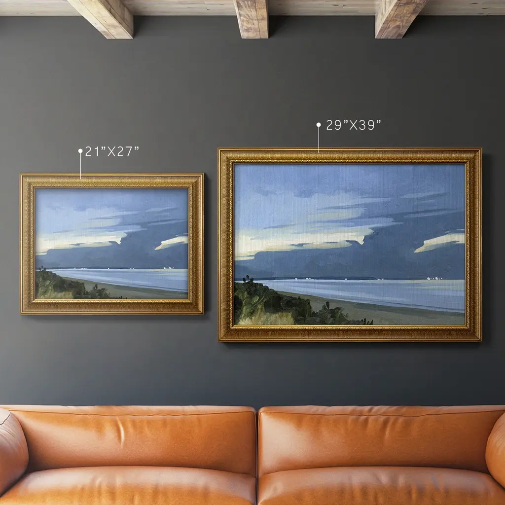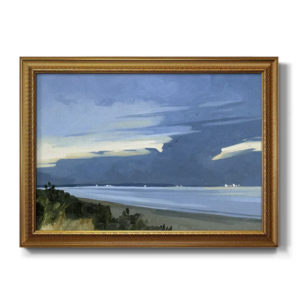 Blue Ocean Evening I Premium Framed Canvas- Ready to Hang A Premium Framed Canvas created to last. Framed in distressed wood and available in an array of sizes and colors Featuring a beveled a solid wood stretcher bar, each piece comes ready to hand 3 SIZES AVAILABLE 16''X20'' - Overall Size 18'X27'' - Overall Size 24''x36'' - Overall Size Each piece is made to order. Each piece comes with hanging hardware. Made in the USA Ready to Hang Giclee Paper Print Acrylic Glass Beveled Matt Board