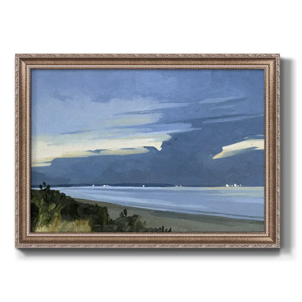 Blue Ocean Evening I Premium Framed Canvas- Ready to Hang A Premium Framed Canvas created to last. Framed in distressed wood and available in an array of sizes and colors Featuring a beveled a solid wood stretcher bar, each piece comes ready to hand 3 SIZES AVAILABLE 16''X20'' - Overall Size 18'X27'' - Overall Size 24''x36'' - Overall Size Each piece is made to order. Each piece comes with hanging hardware. Made in the USA Ready to Hang Giclee Paper Print Acrylic Glass Beveled Matt Board