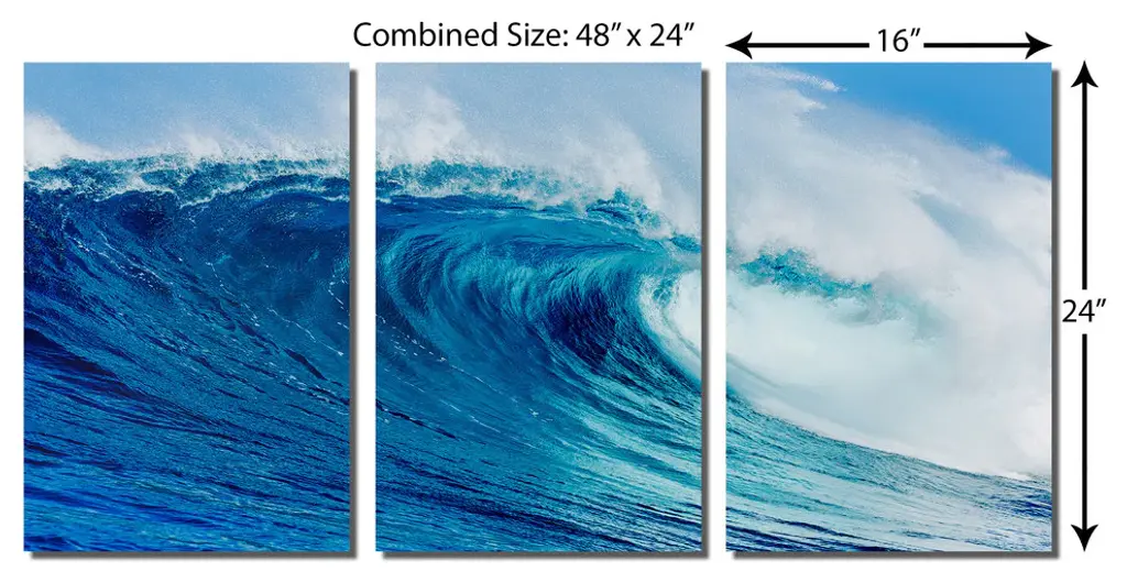 48"œ x 24"œ total size. Ready To Hang! (3 pieces - 16"œ x 24"œ each). 3 Panel Split (Triptych) Blue Ocean Wave Metal Print. Modern metal wall art for home or office wall decor & interior design. Printed on Luxurious, HD aluminum glossy metal panels. Multi panel art.. HD aluminum panels. Metal print wall art. Includes Shadow Wall Mount on the back.• Aluminum Metal Wall Art• Made in USA• Ready to hang - No assembly required• Shadow mount hardware on the back• 0.045"œ thick HD Aluminum Panels• Scratch resistant, glossy finish• Superb color clarity, luxurious prints• Epson printing process• For indoor or moisture rich environment use• Easy to clean. Gently wipe with microfiber cloth.