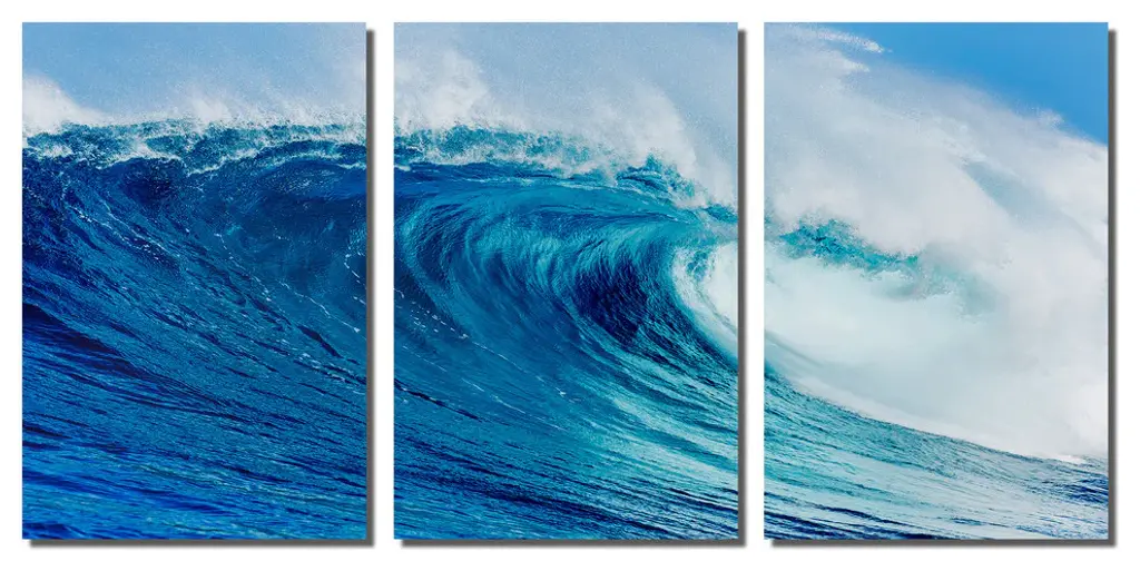 60"œ x 30"œ total size. Ready To Hang! (3 pieces - 20"œ x 30"œ each). 3 Panel Split (Triptych) Blue Ocean Wave Metal Print. Modern metal wall art for home or office wall decor & interior design. Printed on Luxurious, HD aluminum glossy metal panels. Multi panel art.. HD aluminum panels. Metal print wall art. Includes Shadow Wall Mount on the back.• Aluminum Metal Wall Art• Made in USA• Ready to hang - No assembly required• Shadow mount hardware on the back• 0.045"œ thick HD Aluminum Panels• Scratch resistant, glossy finish• Superb color clarity, luxurious prints• Epson printing process• For indoor or moisture rich environment use• Easy to clean. Gently wipe with microfiber cloth.