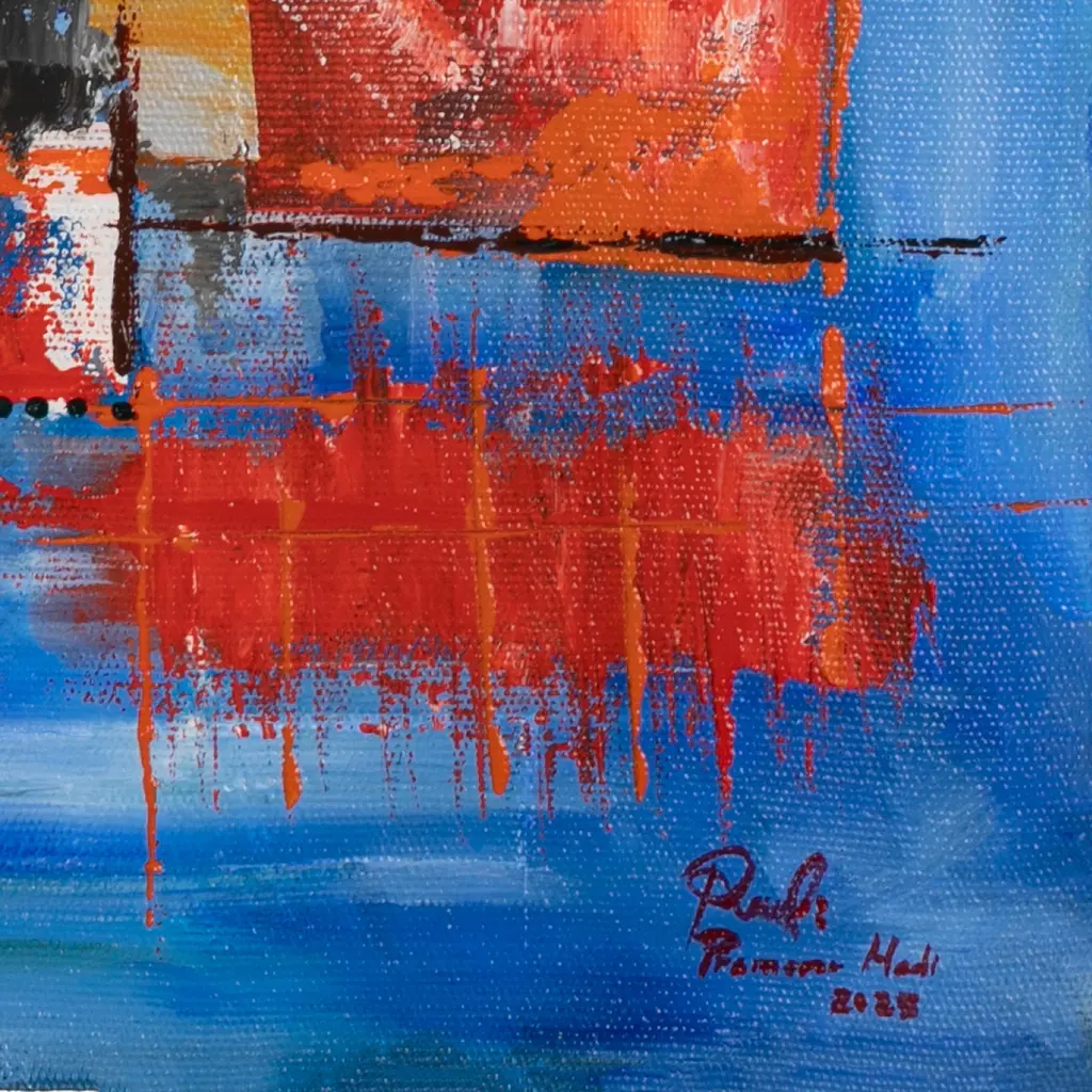 Layers of blue, orange, brown, grey, yellow, black, red and grey acrylics come alive in this dynamic abstract painting by Pramono Hadi. The Javanese artist explains the inspiration behind it: "A long time ago, children used to sit and watch the train pass at Prambanan Station, accompanied by their parents. For the kids, it was a fun thing to do in the evening. As for the parents, the passing trains reminded them of their loved ones who lived somewhere else and couldn't afford to come back home. This artwork is an homage to anyone who is missing their loved ones living in a different city or country." A captivating expression of modern artistry, this vibrant composition is sure to stand out in any setting.