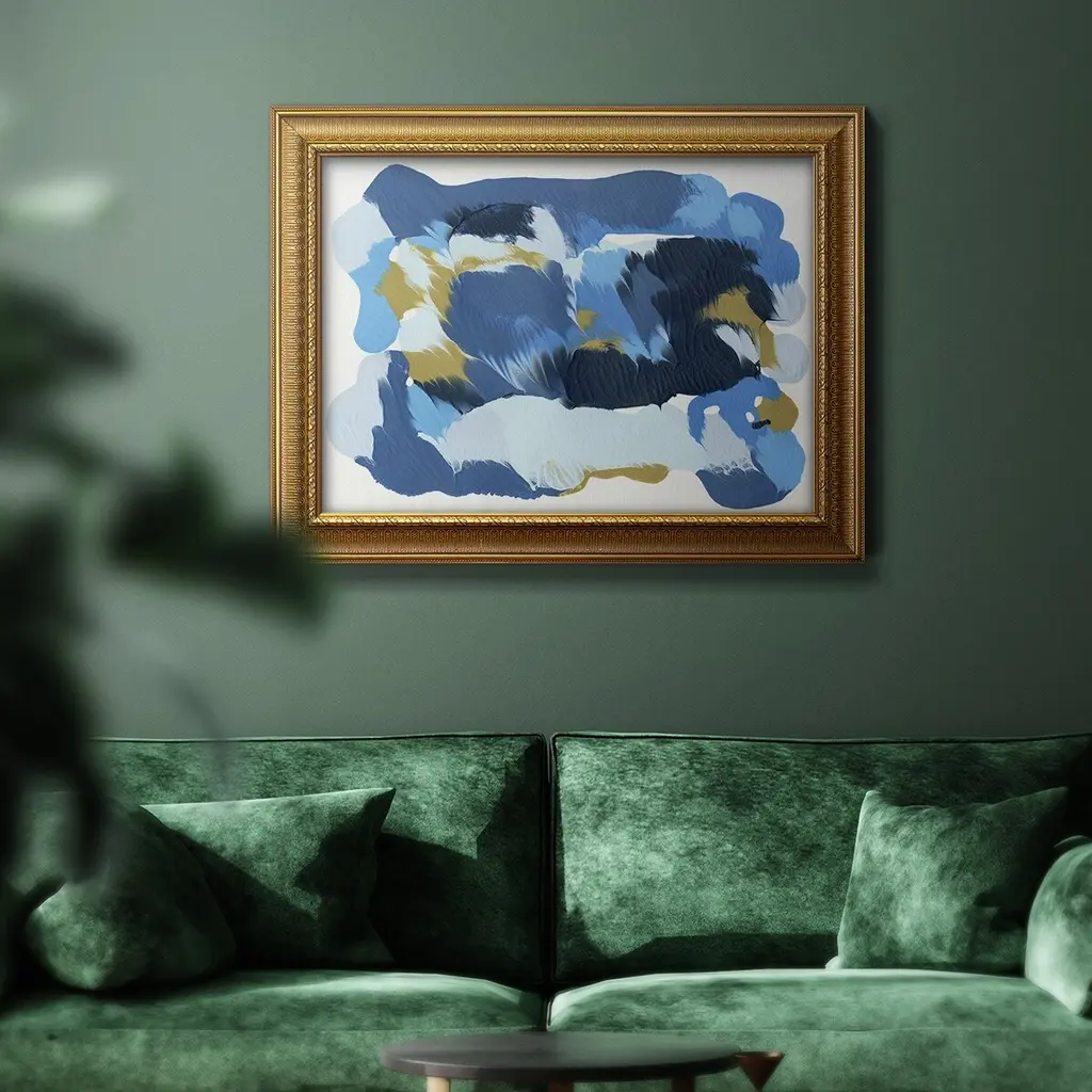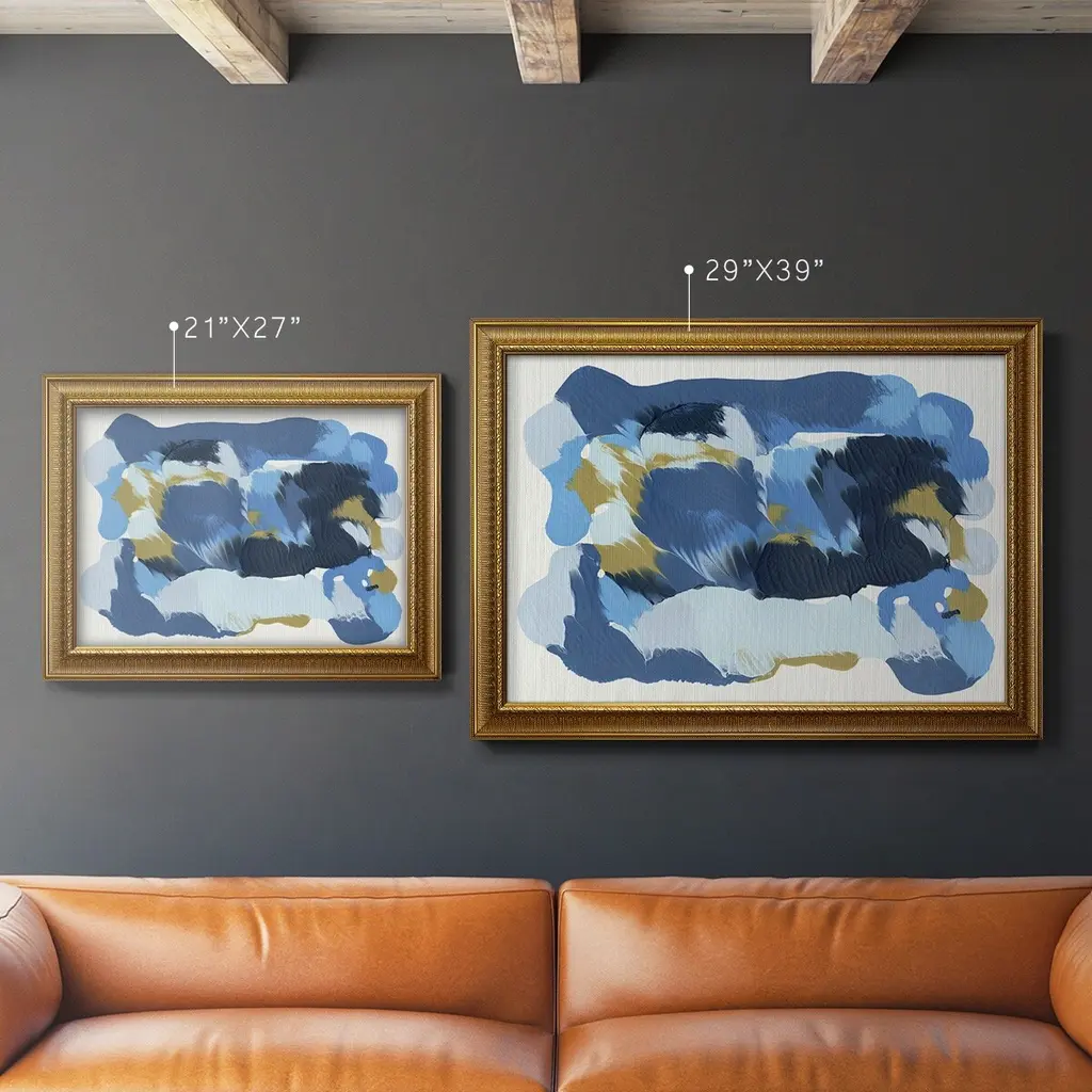 Blue Overture I Premium Framed Canvas- Ready to Hang A Premium Framed Canvas created to last. Framed in distressed wood and available in an array of sizes and colors Featuring a beveled a solid wood stretcher bar, each piece comes ready to hand 3 SIZES AVAILABLE 16''X20'' - Overall Size 18'X27'' - Overall Size 24''x36'' - Overall Size Each piece is made to order. Each piece comes with hanging hardware. Made in the USA Ready to Hang Giclee Paper Print Acrylic Glass Beveled Matt Board