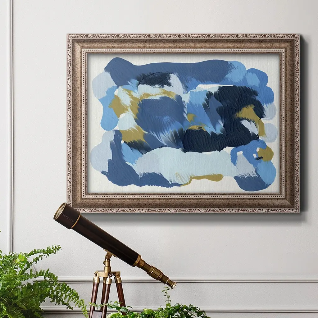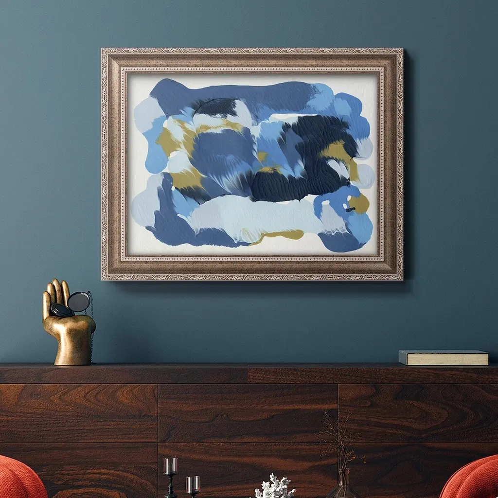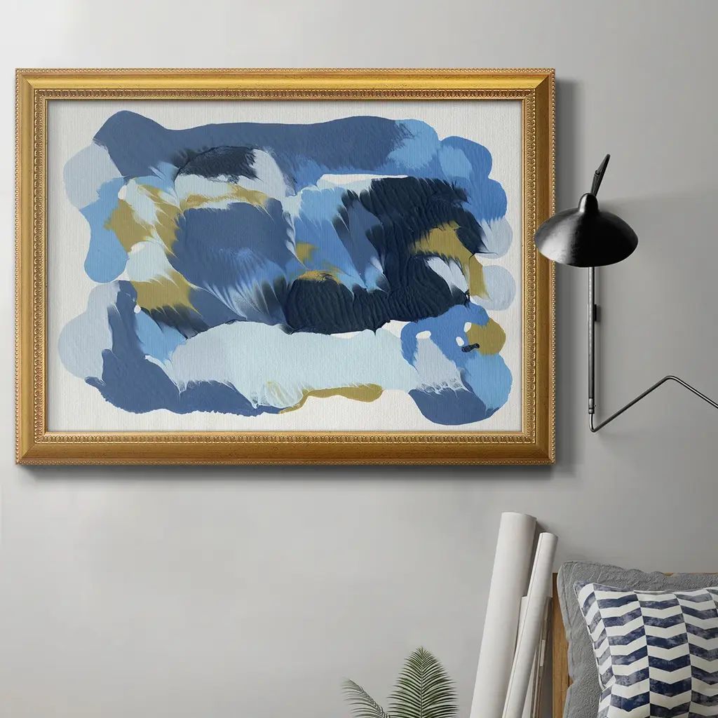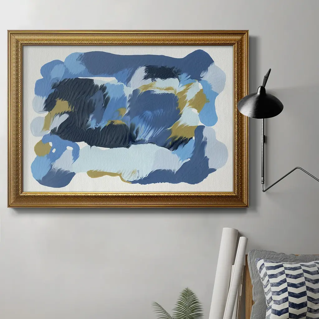 Blue Overture I Premium Framed Canvas- Ready to Hang A Premium Framed Canvas created to last. Framed in distressed wood and available in an array of sizes and colors Featuring a beveled a solid wood stretcher bar, each piece comes ready to hand 3 SIZES AVAILABLE 16''X20'' - Overall Size 18'X27'' - Overall Size 24''x36'' - Overall Size Each piece is made to order. Each piece comes with hanging hardware. Made in the USA Ready to Hang Giclee Paper Print Acrylic Glass Beveled Matt Board