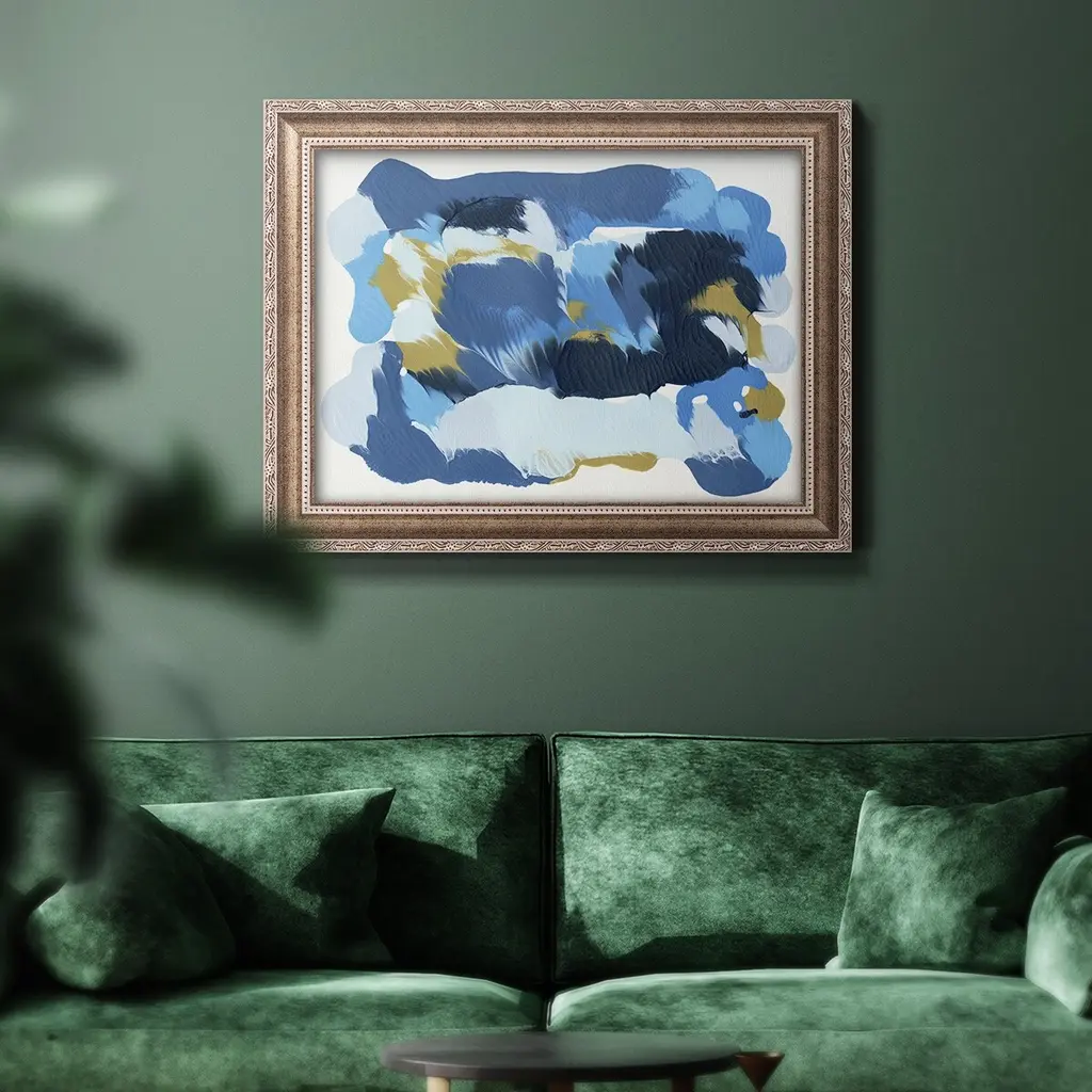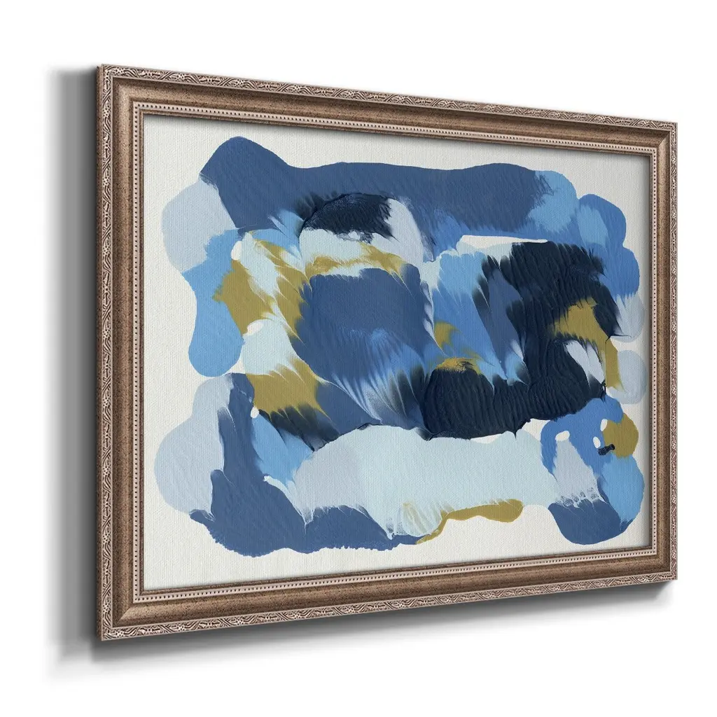 Blue Overture I Premium Framed Canvas- Ready to Hang A Premium Framed Canvas created to last. Framed in distressed wood and available in an array of sizes and colors Featuring a beveled a solid wood stretcher bar, each piece comes ready to hand 3 SIZES AVAILABLE 16''X20'' - Overall Size 18'X27'' - Overall Size 24''x36'' - Overall Size Each piece is made to order. Each piece comes with hanging hardware. Made in the USA Ready to Hang Giclee Paper Print Acrylic Glass Beveled Matt Board