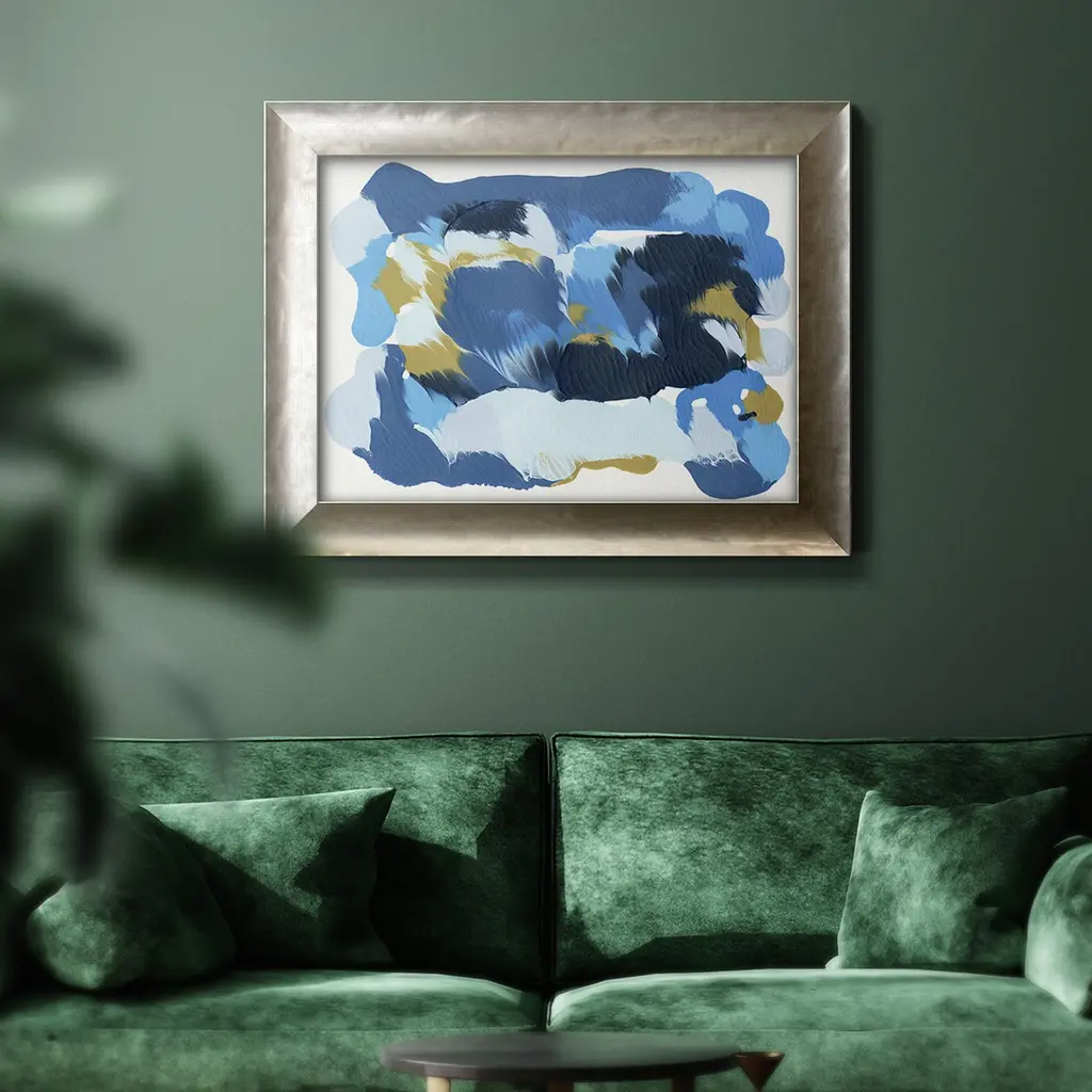 Blue Overture I Premium Framed Canvas- Ready to Hang A Premium Framed Canvas created to last. Framed in distressed wood and available in an array of sizes and colors Featuring a beveled a solid wood stretcher bar, each piece comes ready to hand 3 SIZES AVAILABLE 16''X20'' - Overall Size 18'X27'' - Overall Size 24''x36'' - Overall Size Each piece is made to order. Each piece comes with hanging hardware. Made in the USA Ready to Hang Giclee Paper Print Acrylic Glass Beveled Matt Board