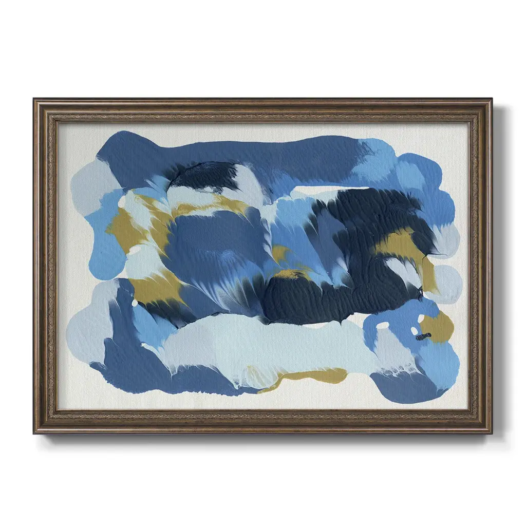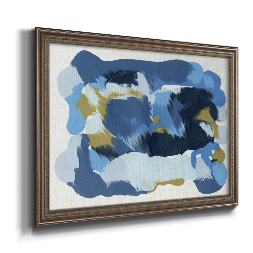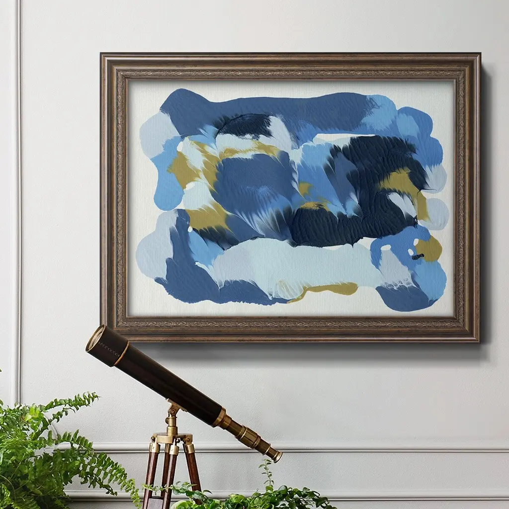 Blue Overture I Premium Framed Canvas- Ready to Hang A Premium Framed Canvas created to last. Framed in distressed wood and available in an array of sizes and colors Featuring a beveled a solid wood stretcher bar, each piece comes ready to hand 3 SIZES AVAILABLE 16''X20'' - Overall Size 18'X27'' - Overall Size 24''x36'' - Overall Size Each piece is made to order. Each piece comes with hanging hardware. Made in the USA Ready to Hang Giclee Paper Print Acrylic Glass Beveled Matt Board