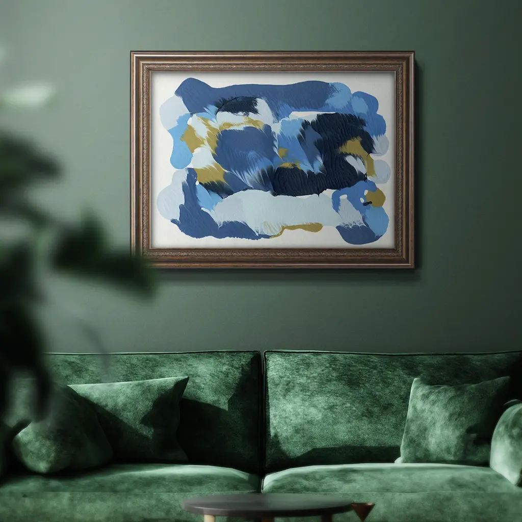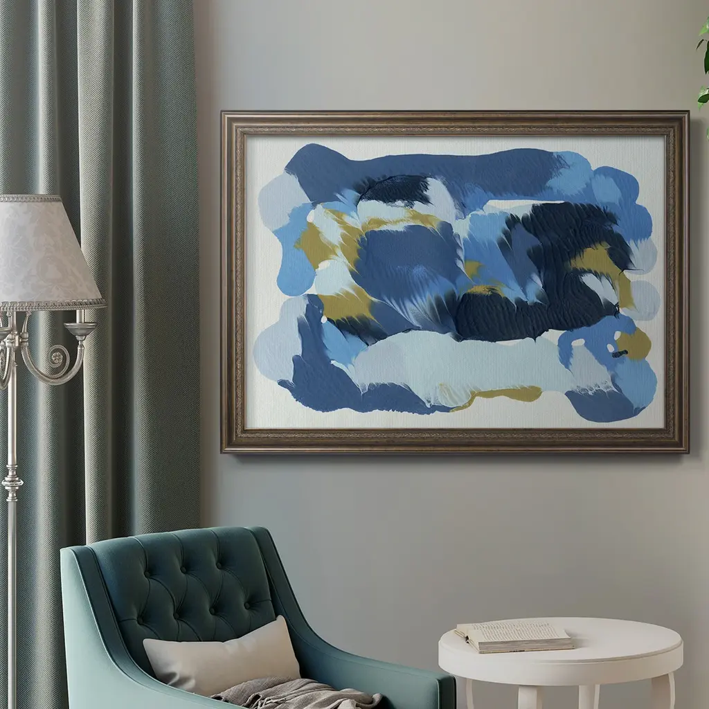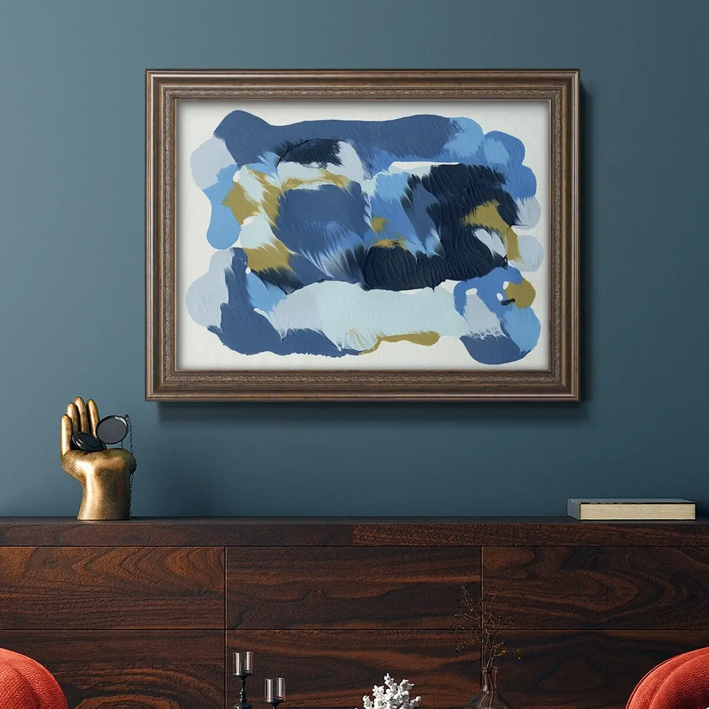 Blue Overture I Premium Framed Canvas- Ready to Hang A Premium Framed Canvas created to last. Framed in distressed wood and available in an array of sizes and colors Featuring a beveled a solid wood stretcher bar, each piece comes ready to hand 3 SIZES AVAILABLE 16''X20'' - Overall Size 18'X27'' - Overall Size 24''x36'' - Overall Size Each piece is made to order. Each piece comes with hanging hardware. Made in the USA Ready to Hang Giclee Paper Print Acrylic Glass Beveled Matt Board