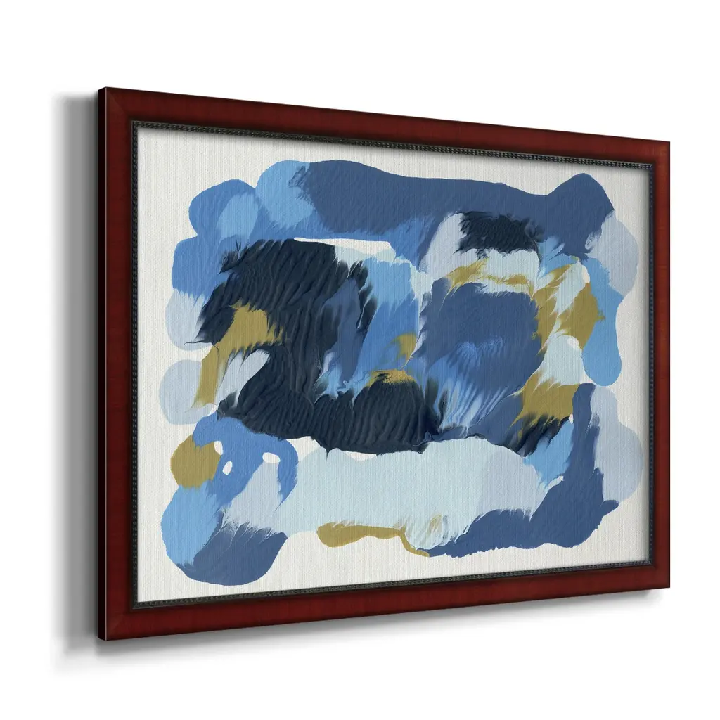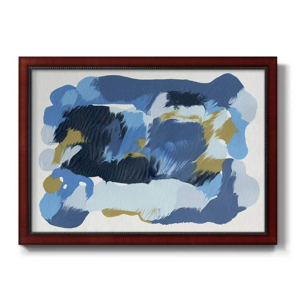 Blue Overture II Premium Framed Canvas- Ready to Hang A Premium Framed Canvas created to last. Framed in distressed wood and available in an array of sizes and colors Featuring a beveled a solid wood stretcher bar, each piece comes ready to hand 3 SIZES AVAILABLE 16''X20'' - Overall Size 18'X27'' - Overall Size 24''x36'' - Overall Size Each piece is made to order. Each piece comes with hanging hardware. Made in the USA Ready to Hang Giclee Paper Print Acrylic Glass Beveled Matt Board