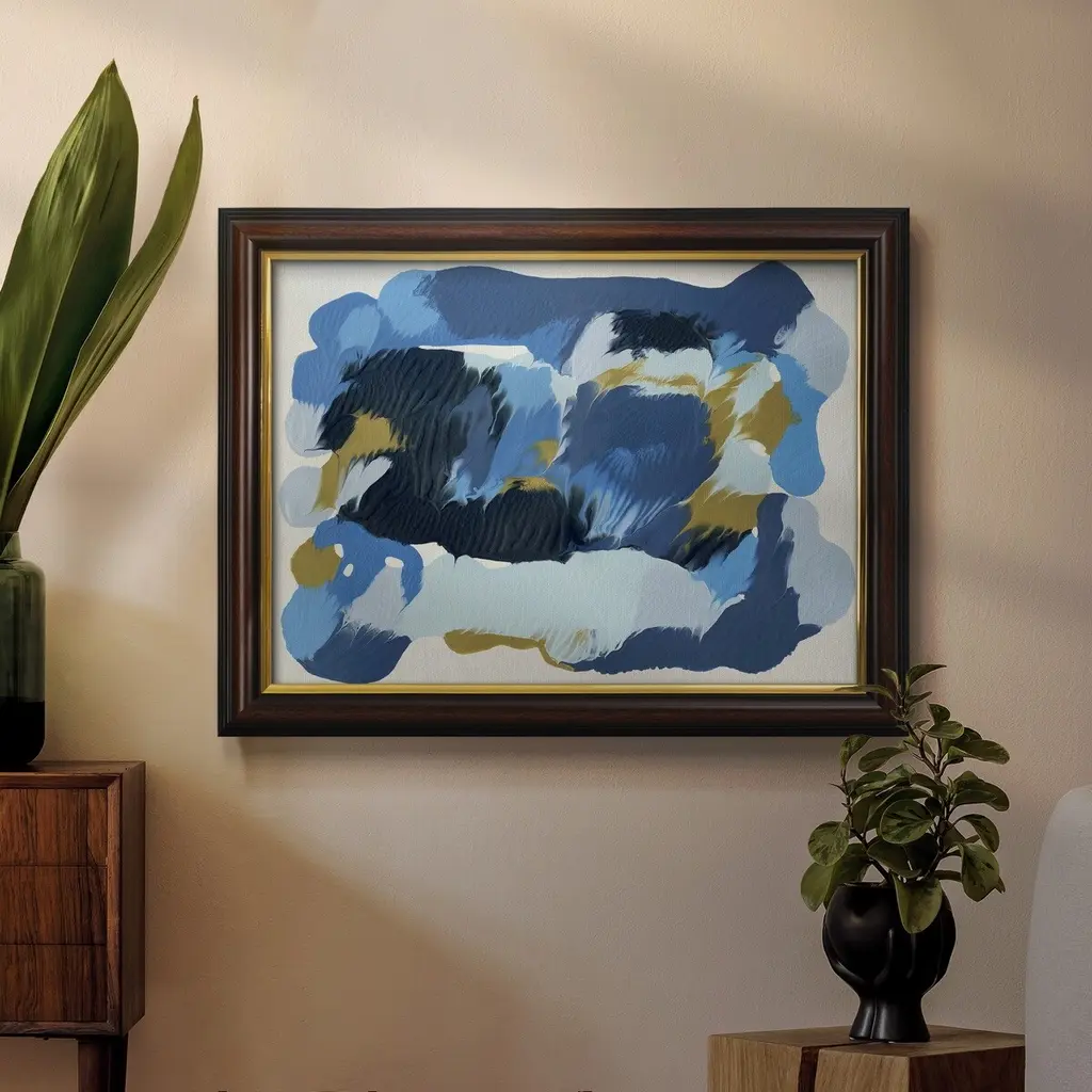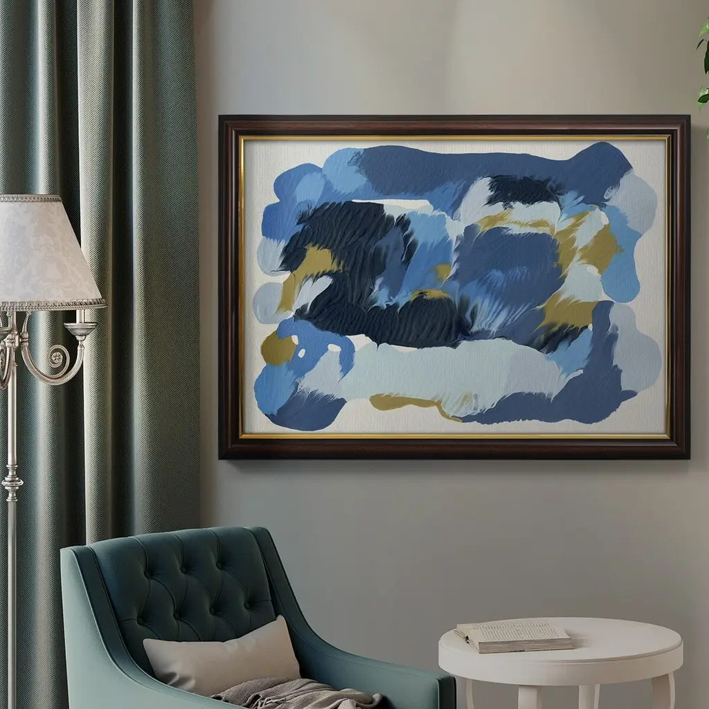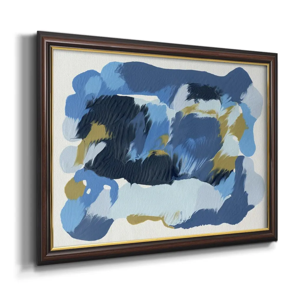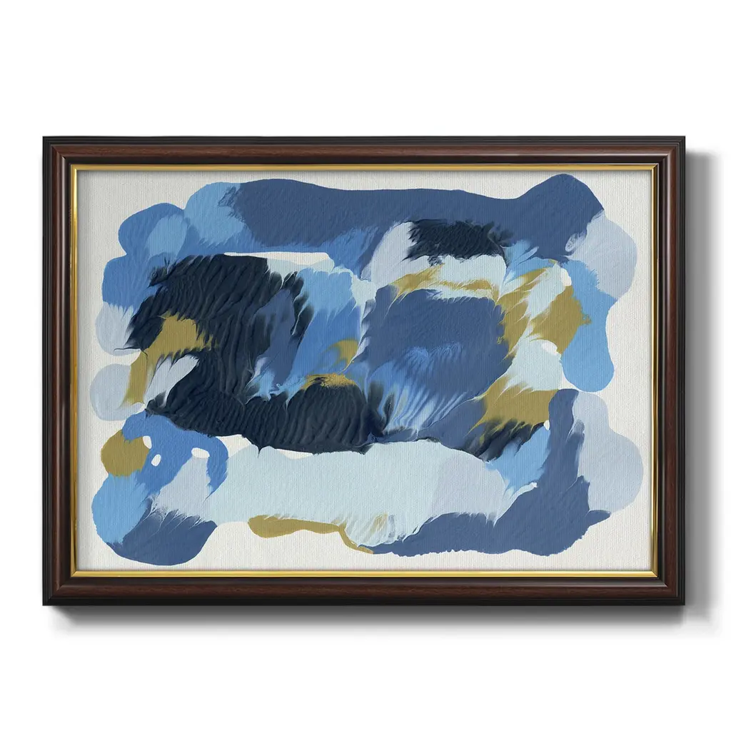 Blue Overture II Premium Framed Canvas- Ready to Hang A Premium Framed Canvas created to last. Framed in distressed wood and available in an array of sizes and colors Featuring a beveled a solid wood stretcher bar, each piece comes ready to hand 3 SIZES AVAILABLE 16''X20'' - Overall Size 18'X27'' - Overall Size 24''x36'' - Overall Size Each piece is made to order. Each piece comes with hanging hardware. Made in the USA Ready to Hang Giclee Paper Print Acrylic Glass Beveled Matt Board