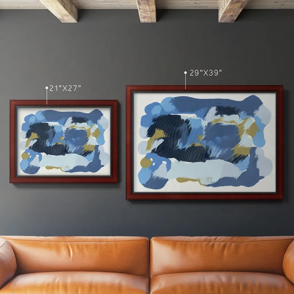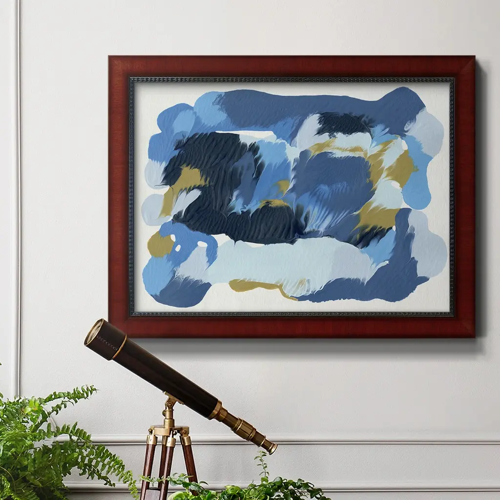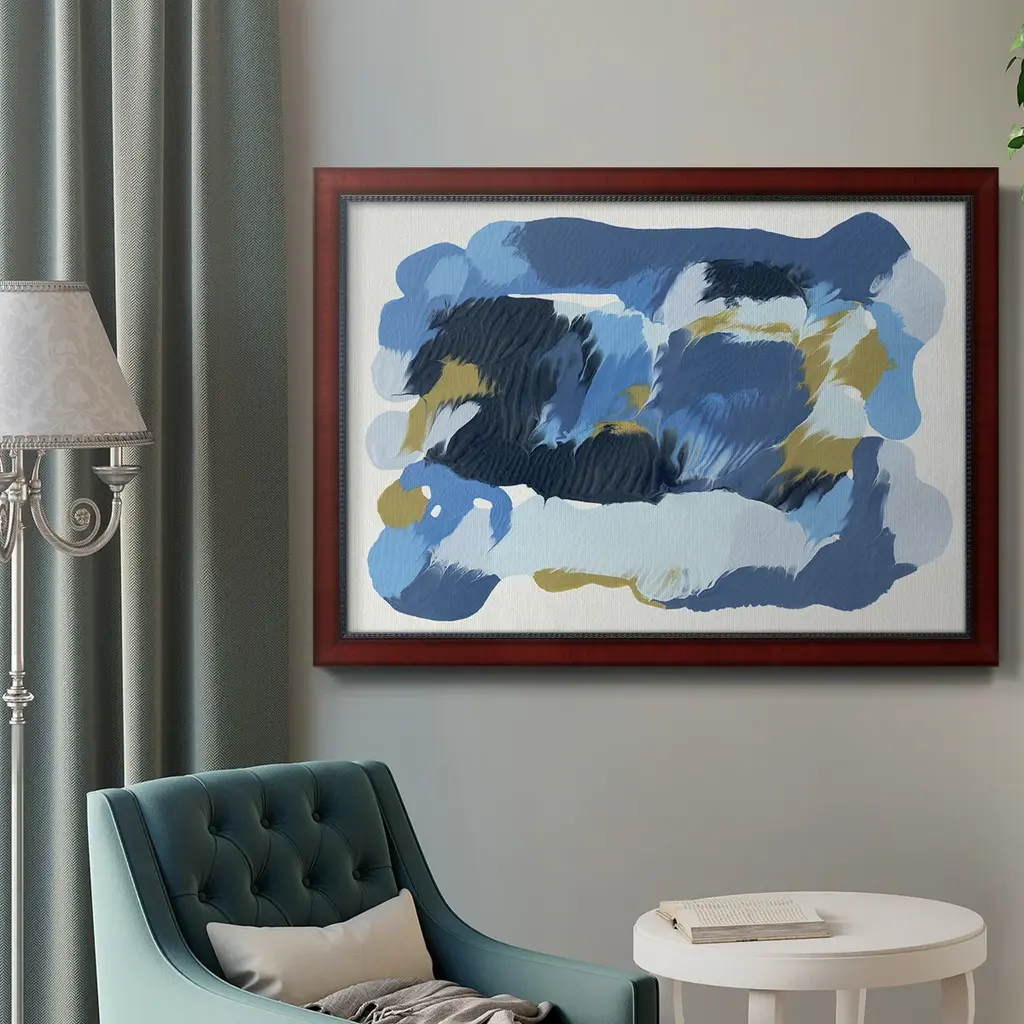 Blue Overture II Premium Framed Canvas- Ready to Hang A Premium Framed Canvas created to last. Framed in distressed wood and available in an array of sizes and colors Featuring a beveled a solid wood stretcher bar, each piece comes ready to hand 3 SIZES AVAILABLE 16''X20'' - Overall Size 18'X27'' - Overall Size 24''x36'' - Overall Size Each piece is made to order. Each piece comes with hanging hardware. Made in the USA Ready to Hang Giclee Paper Print Acrylic Glass Beveled Matt Board