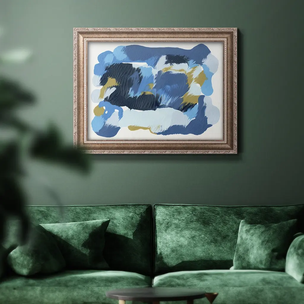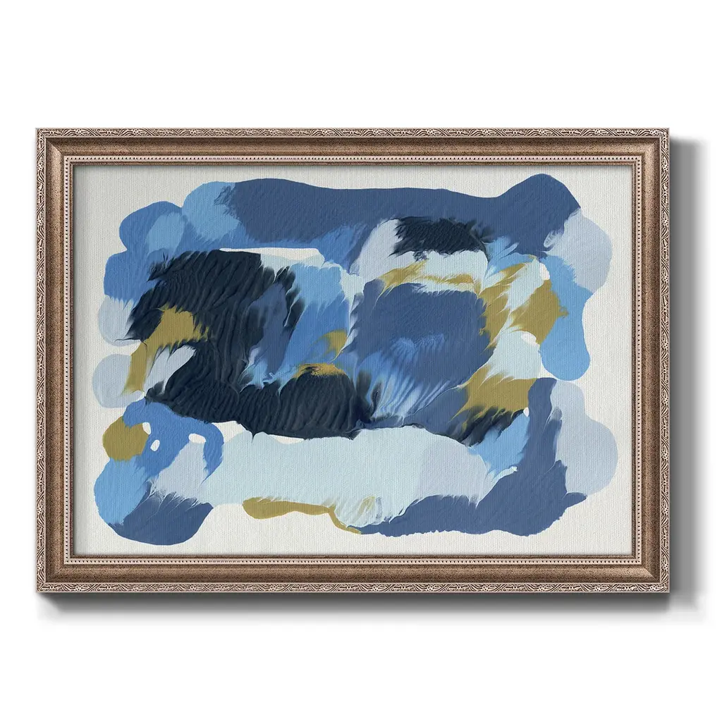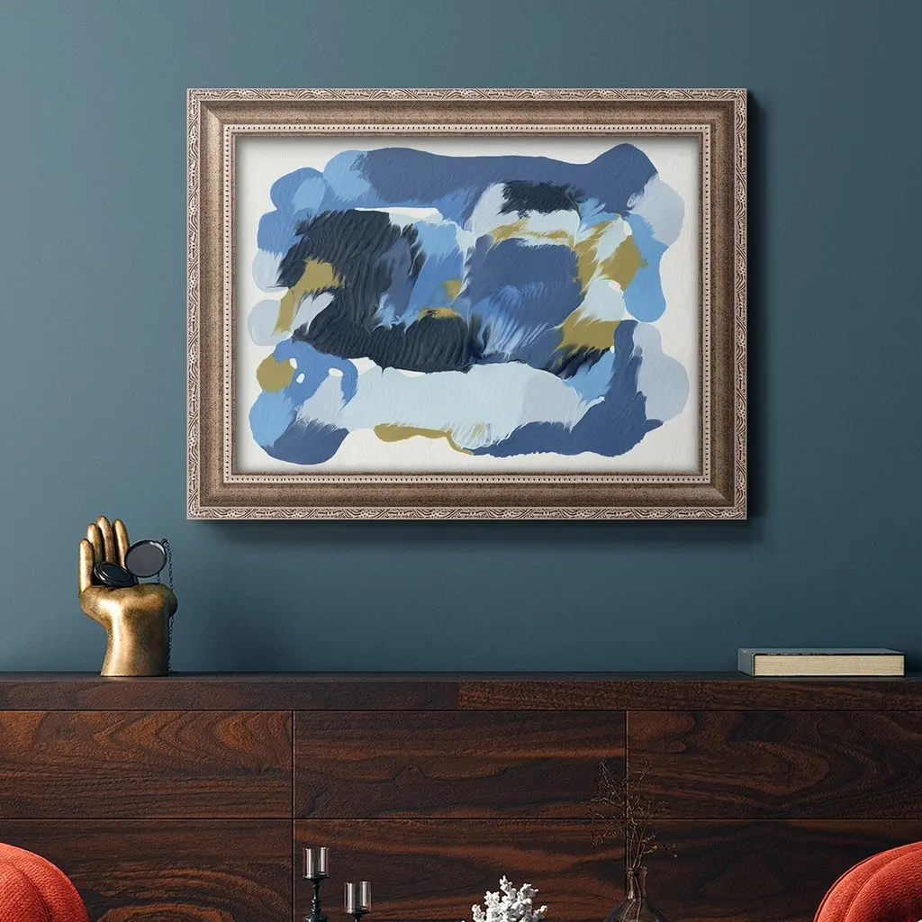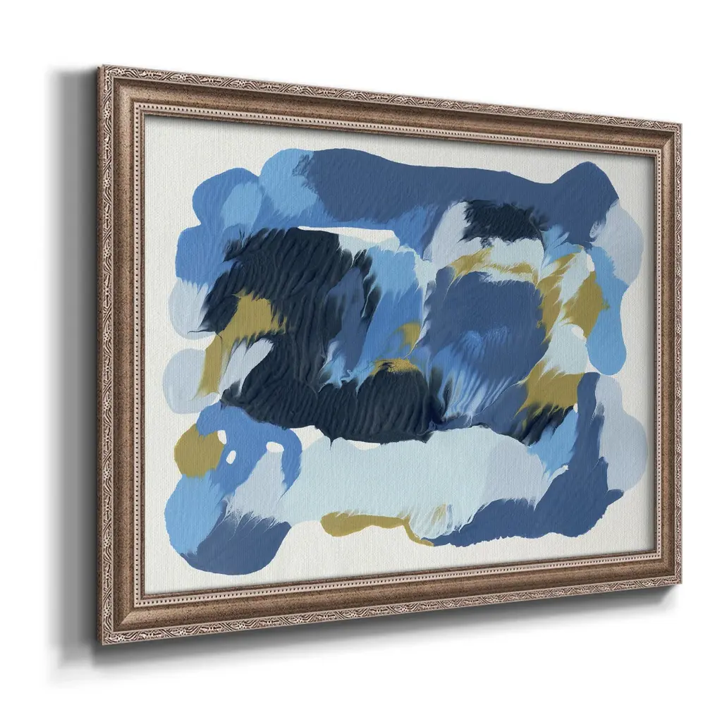 Blue Overture II Premium Framed Canvas- Ready to Hang A Premium Framed Canvas created to last. Framed in distressed wood and available in an array of sizes and colors Featuring a beveled a solid wood stretcher bar, each piece comes ready to hand 3 SIZES AVAILABLE 16''X20'' - Overall Size 18'X27'' - Overall Size 24''x36'' - Overall Size Each piece is made to order. Each piece comes with hanging hardware. Made in the USA Ready to Hang Giclee Paper Print Acrylic Glass Beveled Matt Board