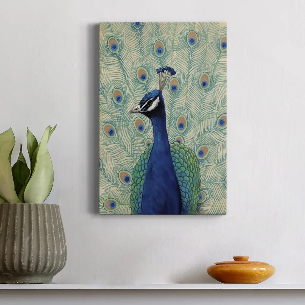 Blue Peacock II Premium Gallery Wrapped Canvas - Ready to Hang A premium hand stretched gallery wrapped canvas print created to last. Featuring a beveled a solid wood stretcher bar, each piece comes ready to hand 6 SIZES AVAILABLE 8''X12'' - Overall Size 12''X18'' - Overall Size 18''X27'' - Overall Size 24''x36'' - Overall Size 32''x48'' - Overall Size 40''x60'' - Overall Size Each piece is made to order. Built to Last Each piece comes ready to hang Solid wood stretcher Fade and Water resistant Made domestically